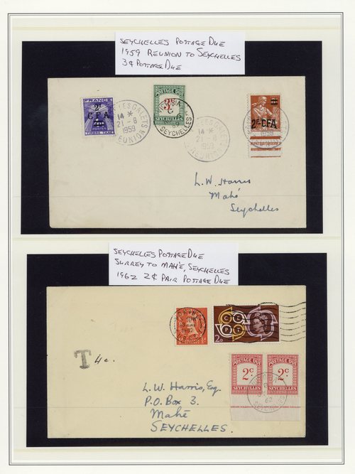 137 : despatch stamps cancelled by "paquebot" handstamp and showing "insufficiently prepaid" handstamp, 2c. and 6c. on 1956 envelopes from La Digue and Victoria addressed locally, 3c. on 1959 envelope from France and 2c. imprint pair on 1962 envelope from