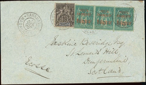 136 : SRC="https://d3ums4016ncdkp.cloudfront.net/auction/main/19048/19048_1366_1.jpg" width="300p" alt="image" ></a></cfif>(x) MadagascarEarly Postal History1896 (12 Dec.) envelope to Scotland franked 1895 poste/francaise 5c. strip of three and Madagascar