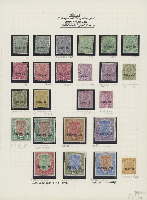 136 : SRC="https://d3ums4016ncdkp.cloudfront.net/auction/main/19055/19055_3113_1.jpg" width="300p" alt="image" ></a></cfif><b>Official Stamps.</b> IndiaOfficial Stamps1912-13 3p. to 25r. set of thirteen with a few shades to 1r., good to fine mint. S.G.