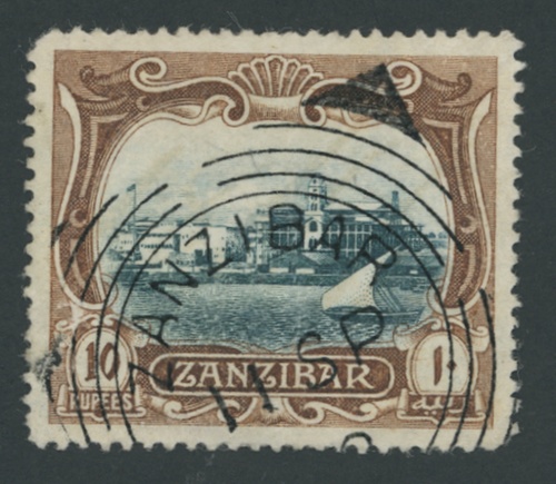 136 : SRC="https://d3ums4016ncdkp.cloudfront.net/auction/main/19055/19055_3313_1.jpg" width="300p" alt="image" ></a></cfif>Zanzibar1908-09 10r. blue-green and brown, used with clear "11 sept" squared-circle datestamp. S.G. 239, £375Subject to 20% VAT
