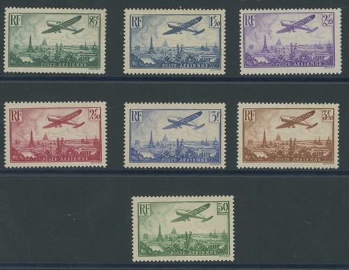 136 : SRC="https://d3ums4016ncdkp.cloudfront.net/auction/main/19027/19027_267_1.jpg" width="300p" alt="image" ></a></cfif><b>1936 Aeroplane over Paris.</b> France1936 Aeroplane over ParisSet of seven to 50f. light green, unmounted mint. Spink maury 8-14,