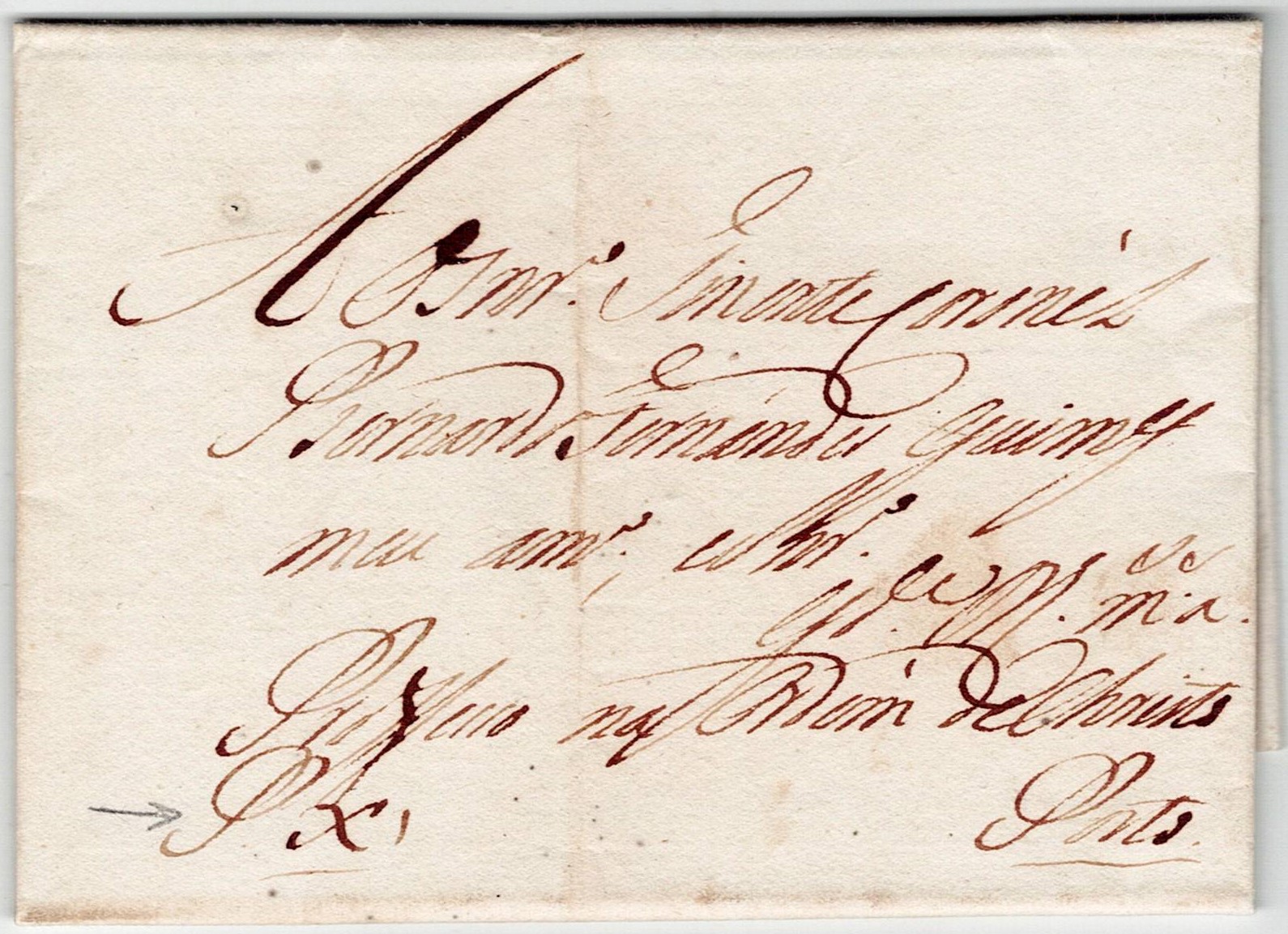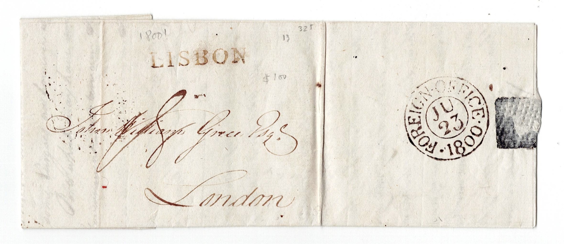 Pre-philately. The LISBON mark. Letter dispatched from Lisbon on February 1, 1800, delivered to the