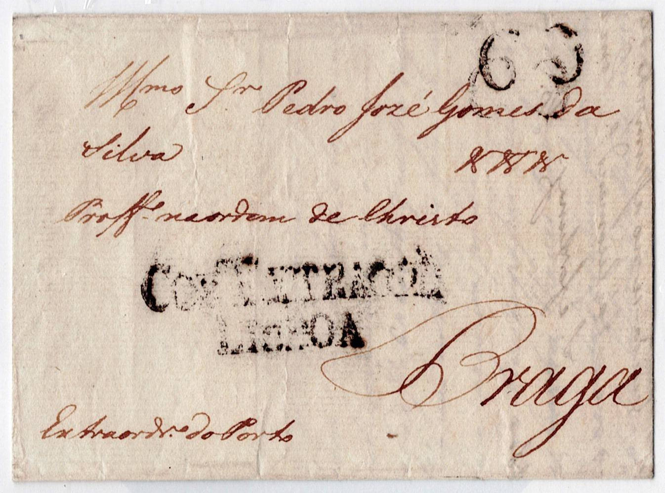 November 1833 to Porto, marked on arrival Porto bar LF PRT-Siege 1 rar 7 and postage 80 Reis.(Image 1)