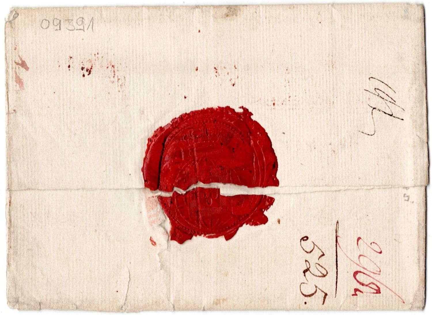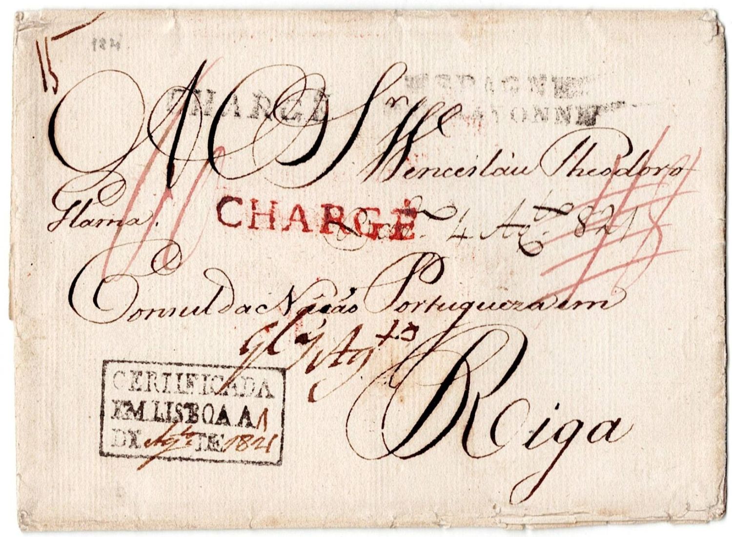 it traveled overland, via Spain, France, and Germany until reaching the Baltic, it was marked "CERTIFIED IN LISBON ON August 1, 1821." This legend, rather than the usual "secure" one applied to letters from the mainland, was intended to inform the