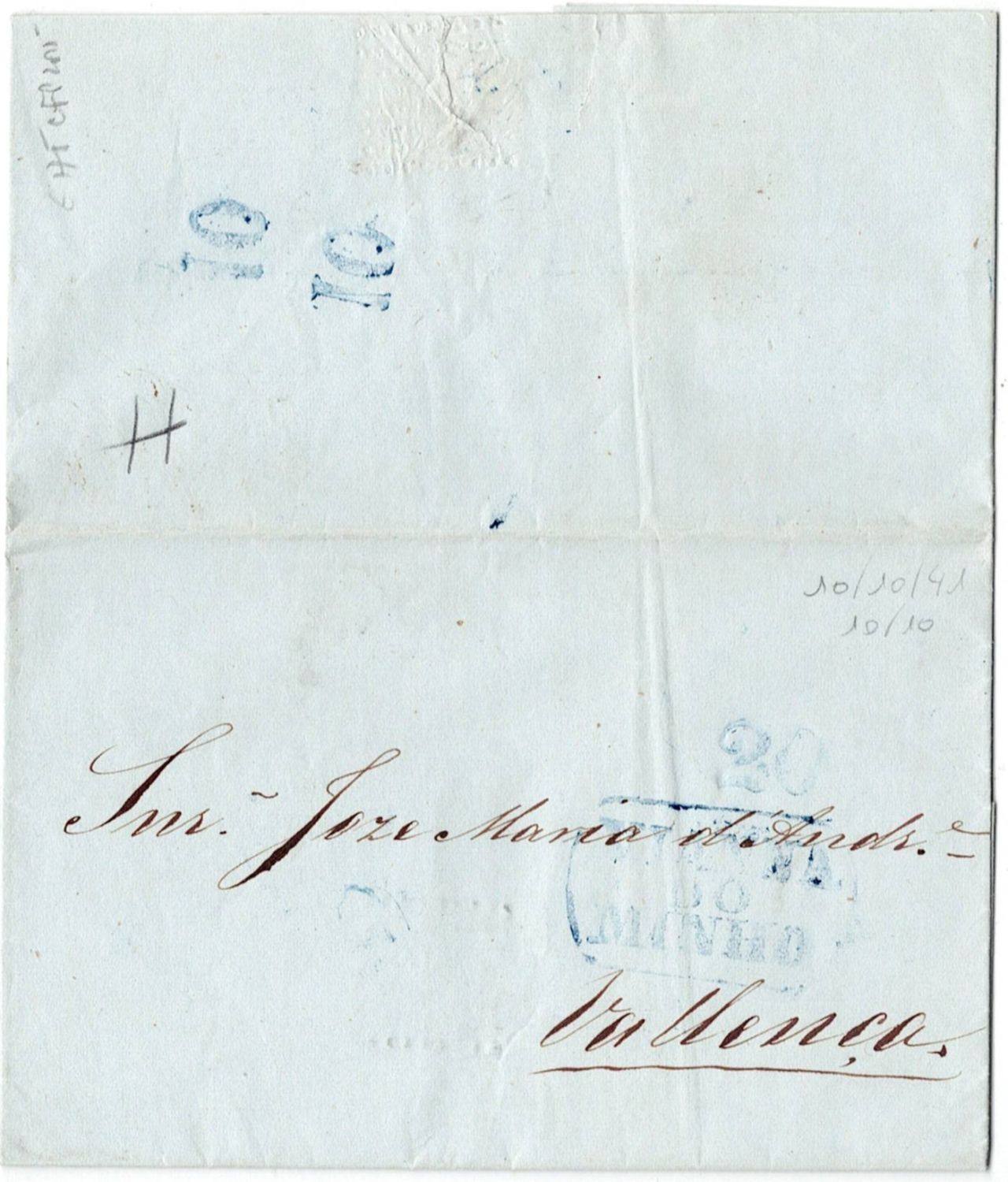 Pre-philately. Letter issued from Viana do Minho on 10.10.1841, wordmark VCT 6 (R5) and postage 20