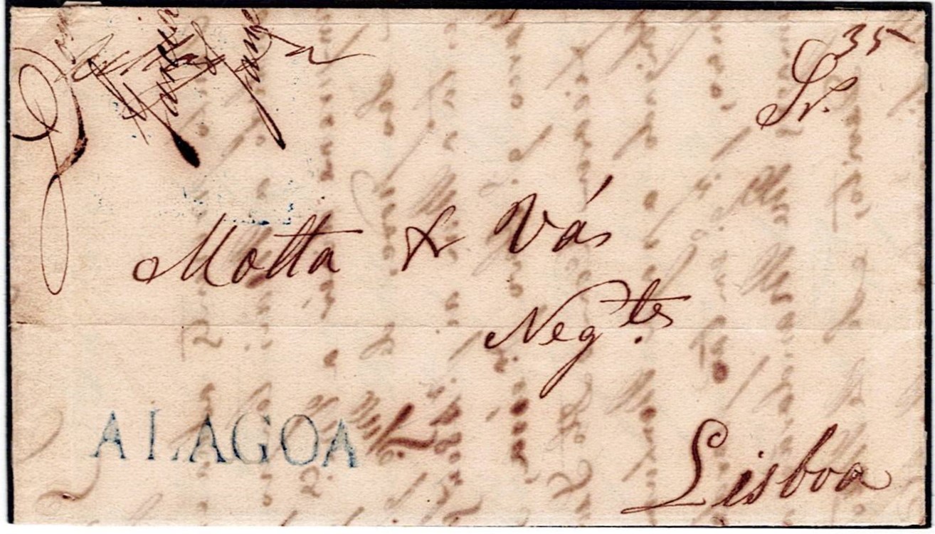 Pre-philately. ALAGOA (Algarve) in blue LF LGA1rar7 on a letter from Lagoa, 8.2.1841 to Lisbon 19.2,