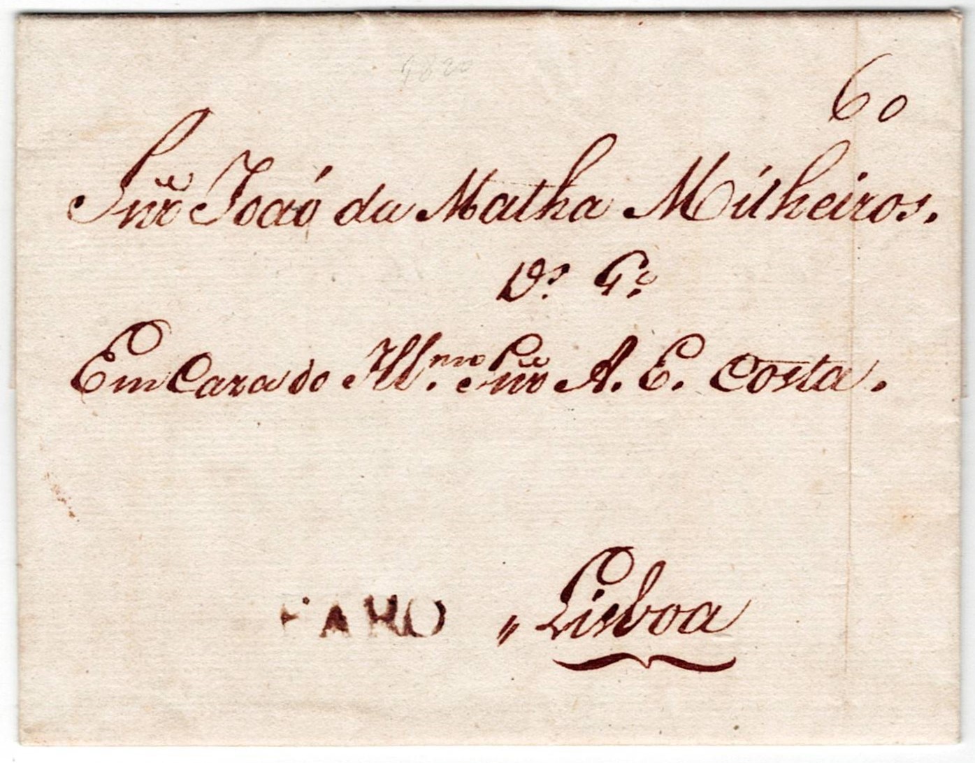 Pre-philately. FARO (Algarve) the sepia LF FAR1 rar4 in a letter from Faro, 12.2.1820 to Lisbon,