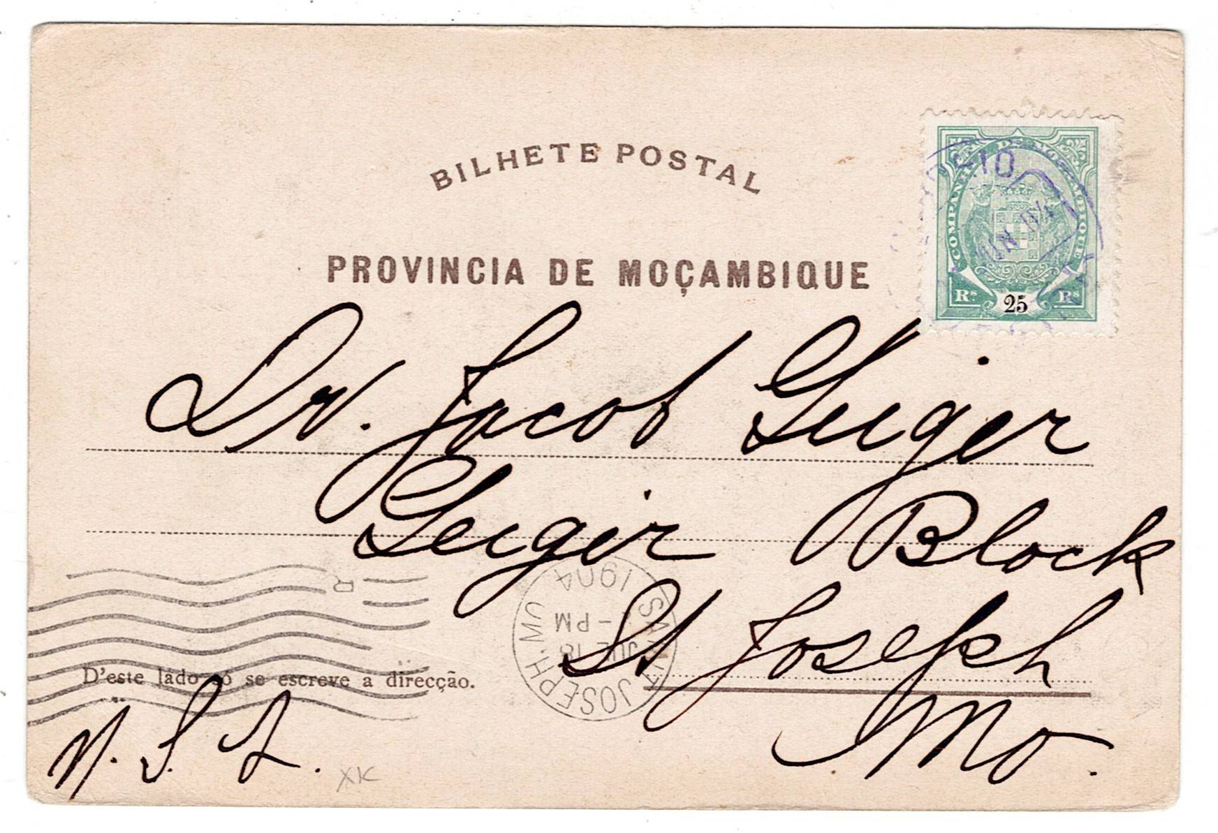 194 imageIllustrated Postcards Mozambique. Monochrome postcard with a view of Conselheiro Ennes Street, BEIRA. Circulated in 1904 from Beira with a 25-elephant kings stamp for St. Joseph MO (Missouri, USA), in good condition.(Image 1) (Image 2)
