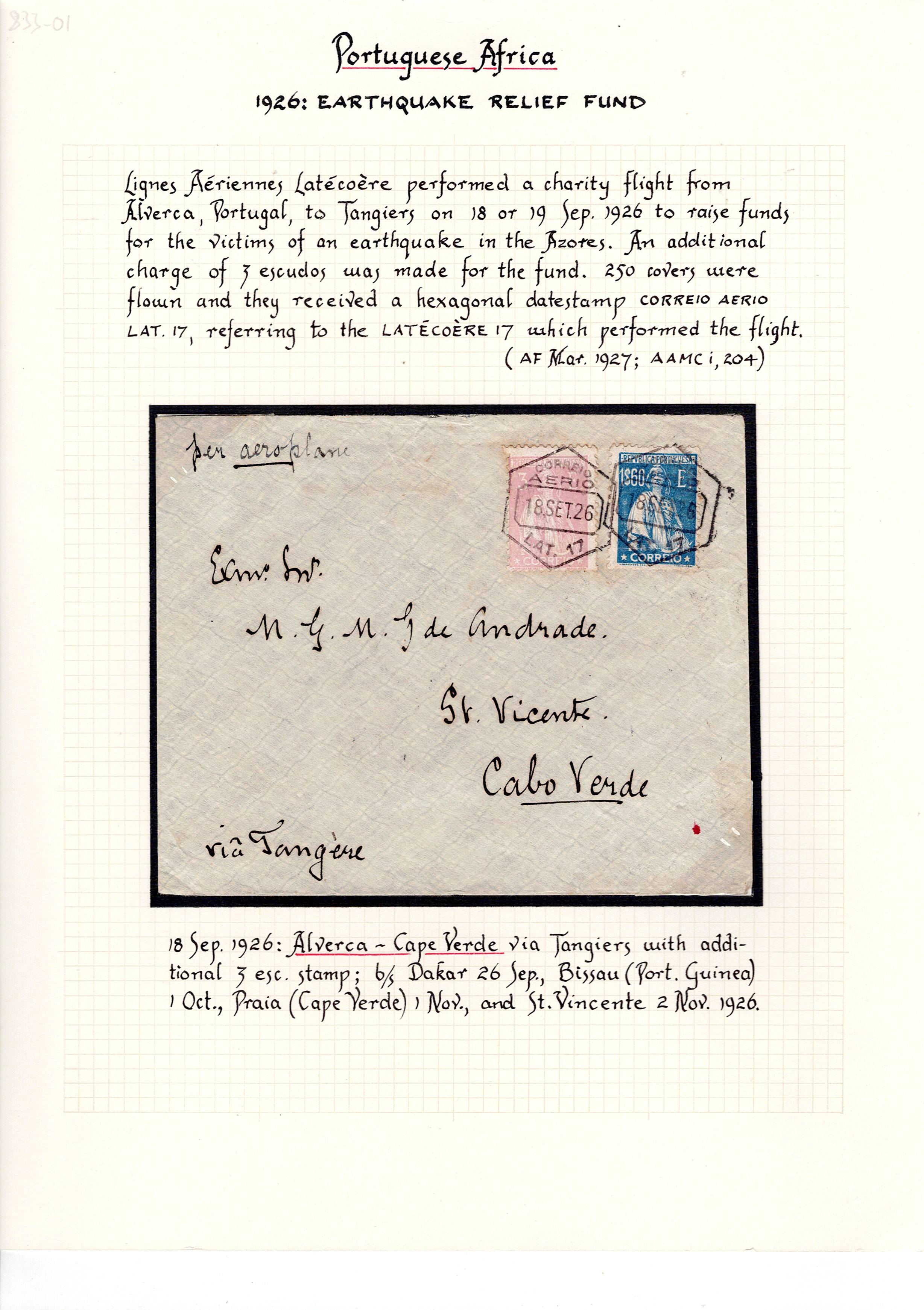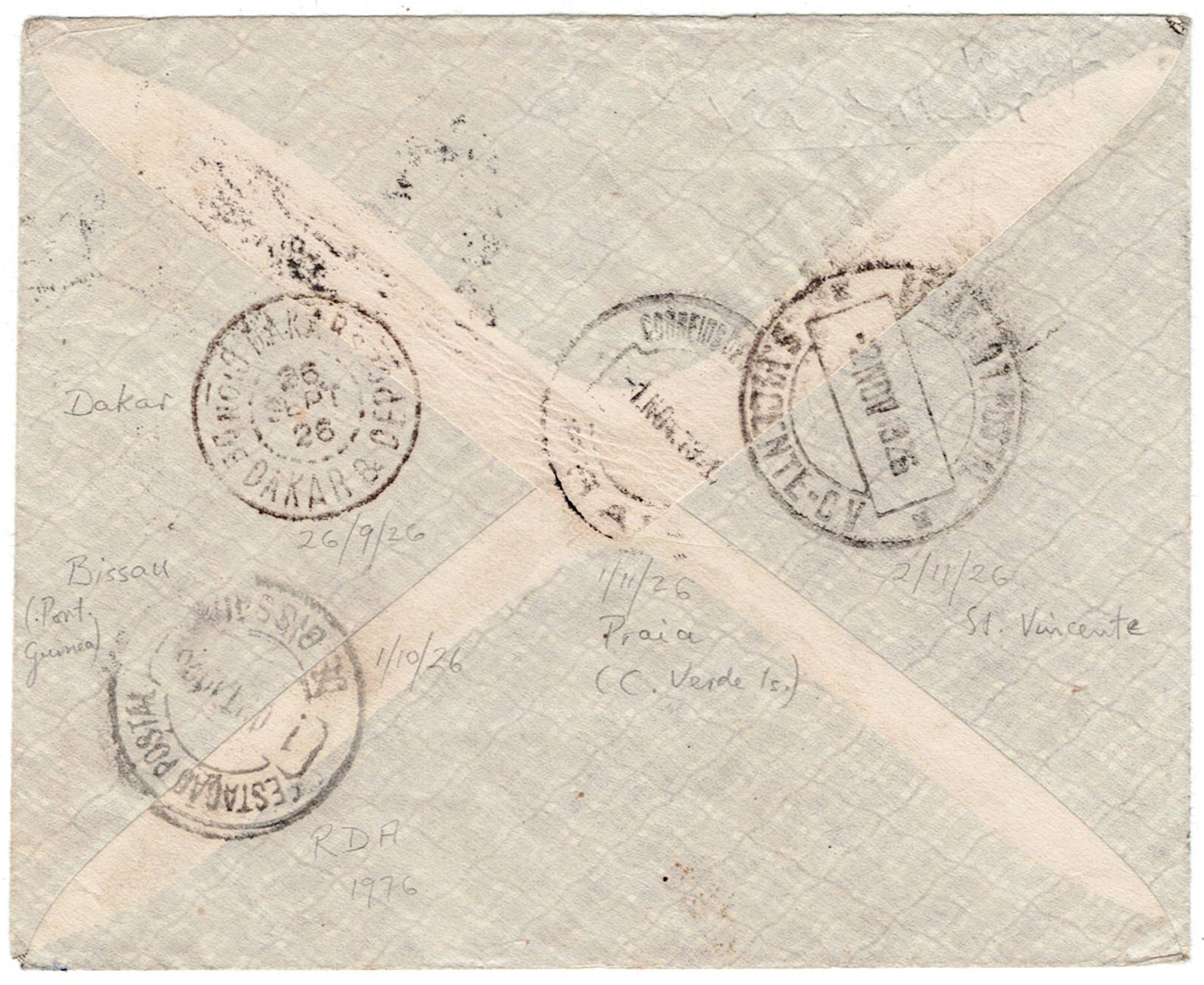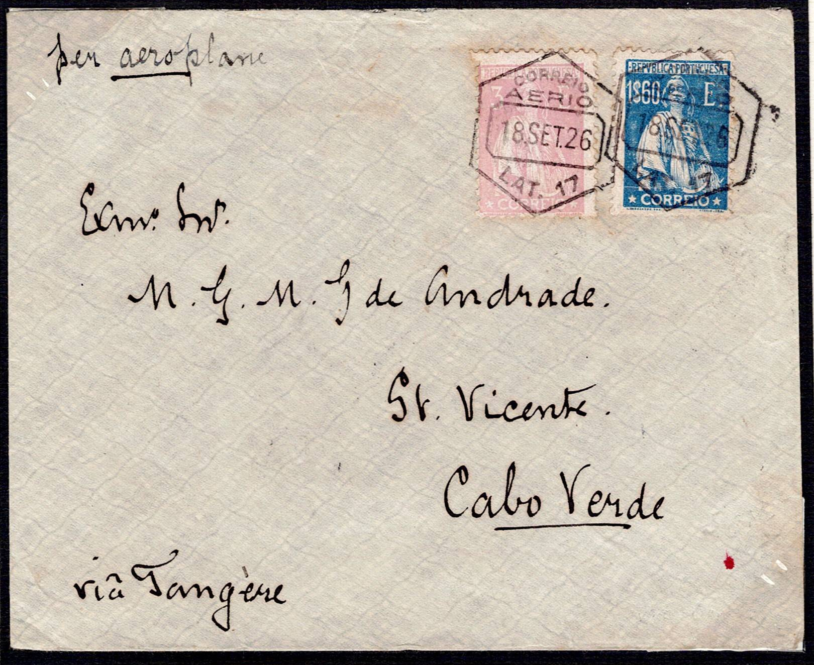 196 imageAirmail. Portugal. Cape Verde. Letter sent from Lisbon on September 18, 1926, by air via Tangier, Dakar on September 26, Bissau on October 1, Praia on November 1, and São Vicente on November 2. Letter transported by LATECOERE, on a flight departing from Alverca, to raise funds for the victims of the earthquake in the Azores. A $3.00 Ceres stamp was added to the $1.60 postage. 250 letters were transported on this flight. MB and MR(Image 1) (Image 2) (Image 3)