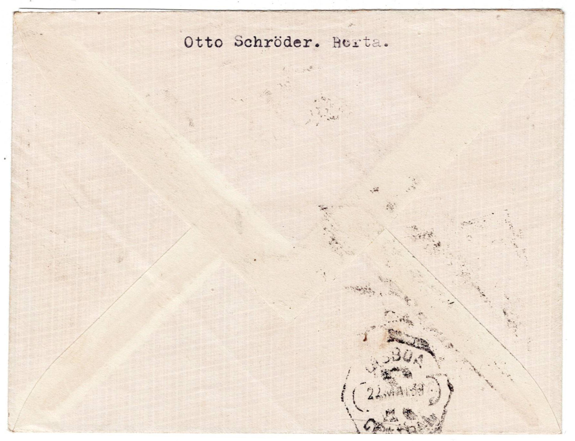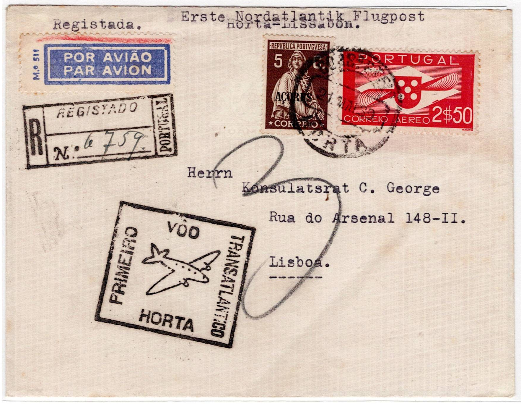 198 imageAirmail. Azores. Registered letter sent from Horta to Lisbon, on the first transatlantic flight from Horta, postage of 2$55, registration mark on arrival in Lisbon €25(Image 1) (Image 2)