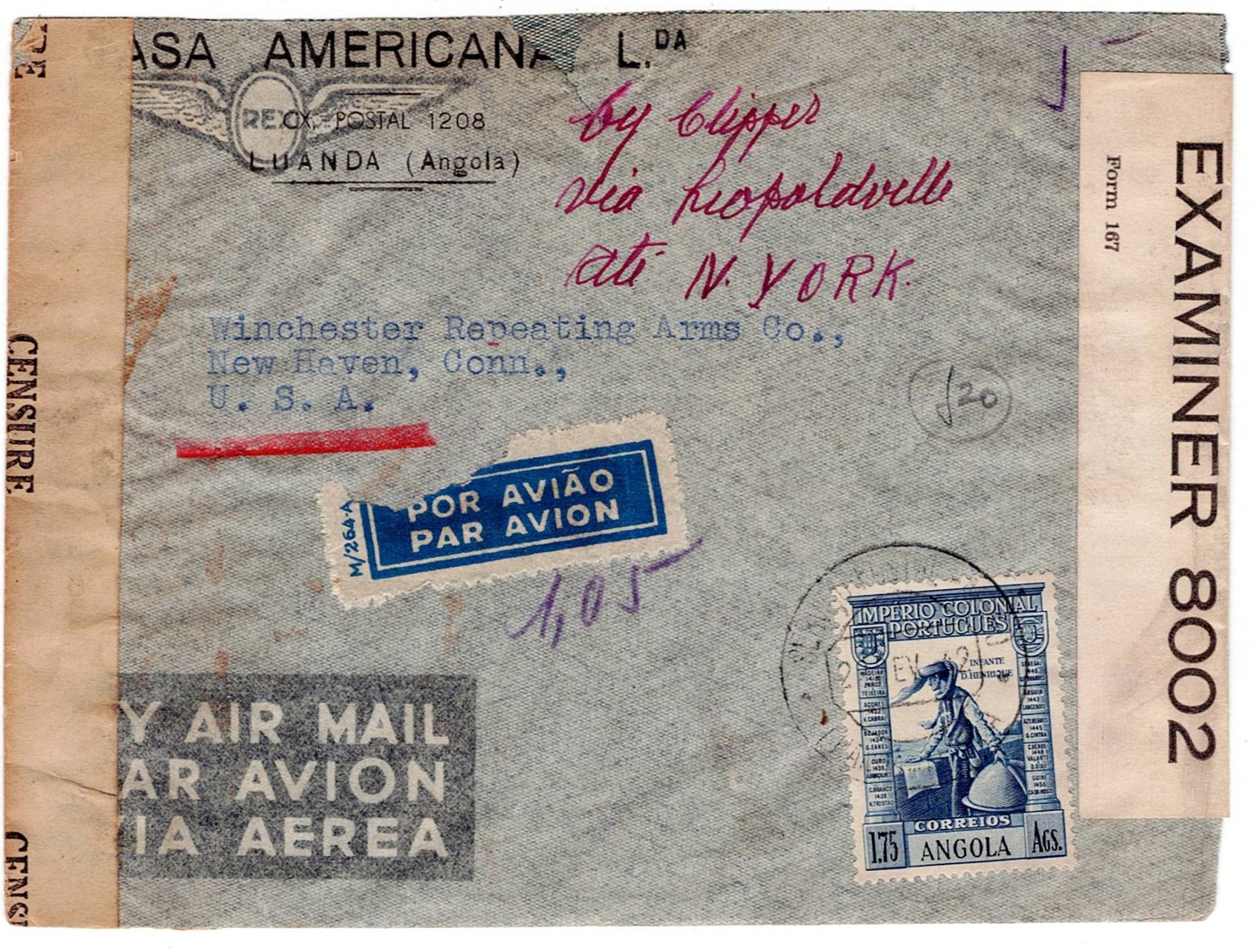 199 imageEnvelope sent by air from Luanda (26.02.42) to New Haven / USA with transit via Leopoldville (28.02.42) with a 1$75 stamp, blue, Portuguese Colonial Empire type, to pay the first postage of ordinary mail for a letter to a foreign country weighing up to 20g, in accordance with Decree No. 23,455 of 12.01.34 of the Ministry of Colonies and handwritten postage of 1.05F equivalent to 10$50 to pay the first postage of the air surcharge for a letter to the USA, weighing up to 5g. Air connection from Luanda to Leopoldville by DTA and from Leopoldville to New York by the 3rd flight of the Clipper of the FAM22 line. Envelope censored in the Belgian Congo with a white band and by the English in Trinidad and Tobago with a white band, type PC 90, censor 8002.(Image 1) (Image 2)