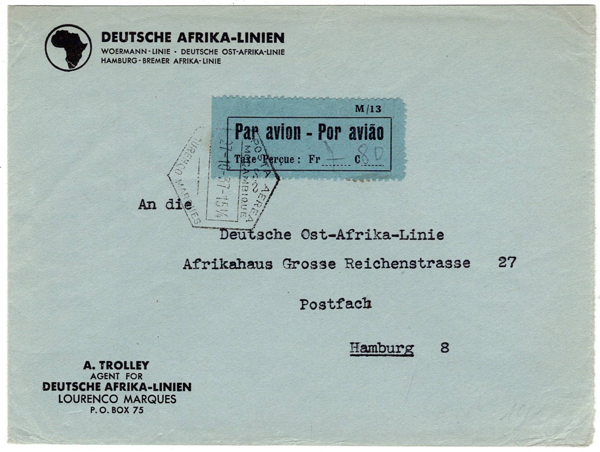 200 imageMozambique 1937 Airmail. Envelope of "DEUTSCHE AFRIKA-LINIEN" circulated from Lourenço Marques 27 October 1937 to Hamburg, Germany with label model M/3, Mf#CA-CE4, with handwritten value of 7$80(Image 1)