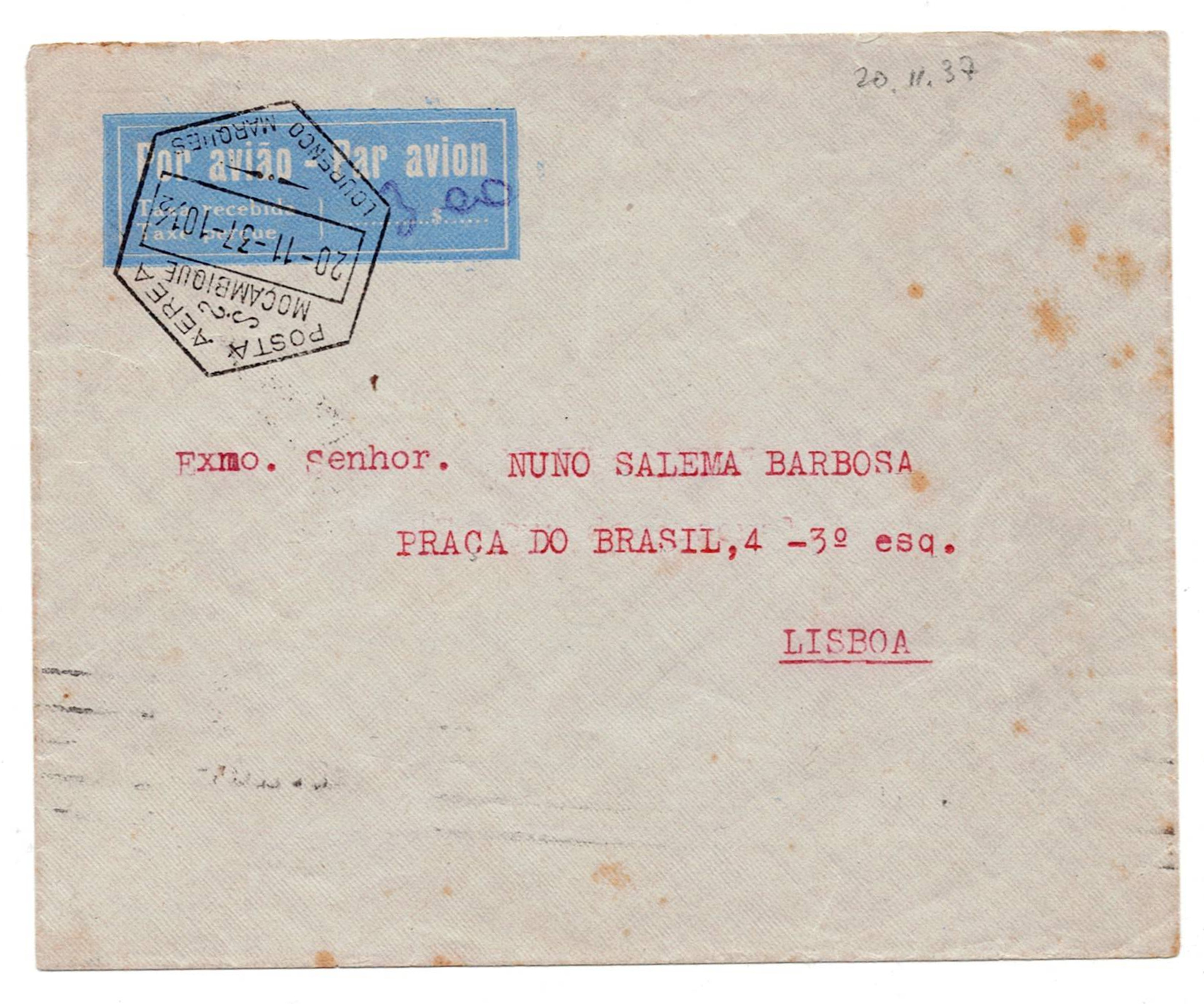 201 imageAirmail. Letter with the rate received by plane/par Avion printed, registered postage 3$00 sent from Lourenço Marques on 20/11/1937 to Lisbon where it arrived on 1 December R, MB(Image 1)