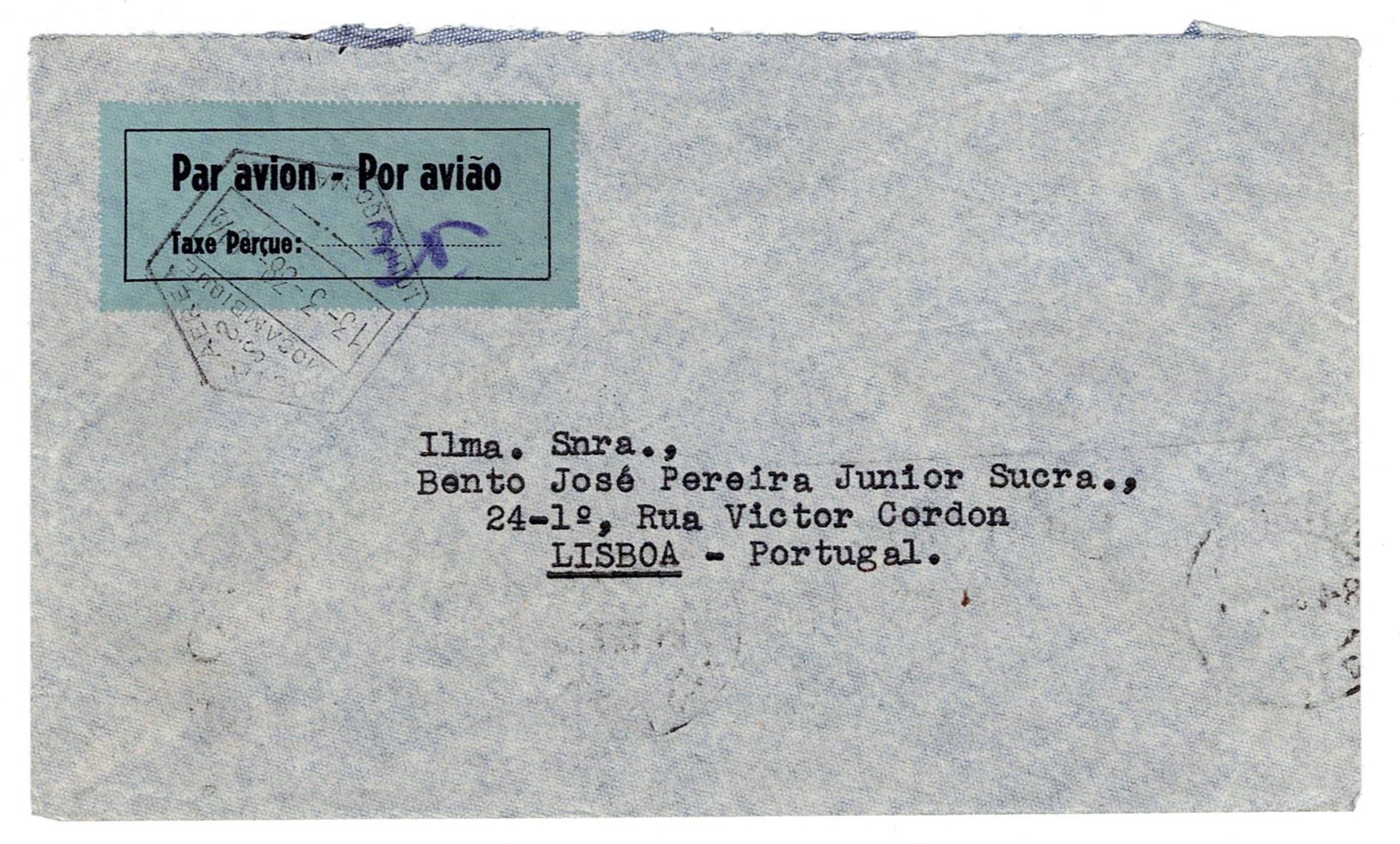 203 imageAirmail. Letter with fee received by plane/par avion printed, postage of 3$00, sent from Lourenço Marques on 03/09/1938, arrival in Lisbon on 03/17.(Image 1)