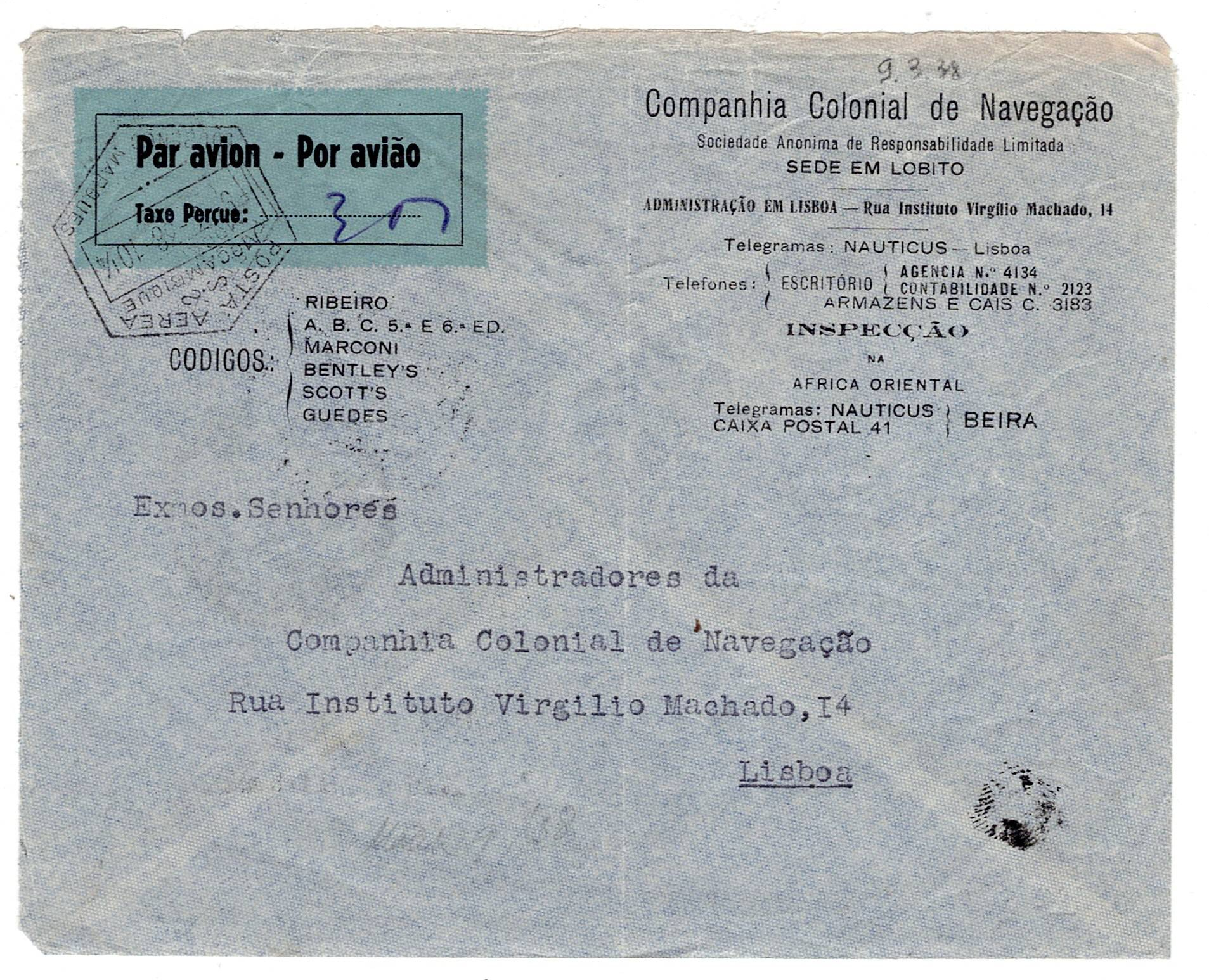 202 imageAirmail. letter with the fee received by plane /par Avion Impressa registered postage of 3$00 sent from Lourenço Marques on 13/03/1938 to Lisbon arrival on 23/3. R and MB.(Image 1)