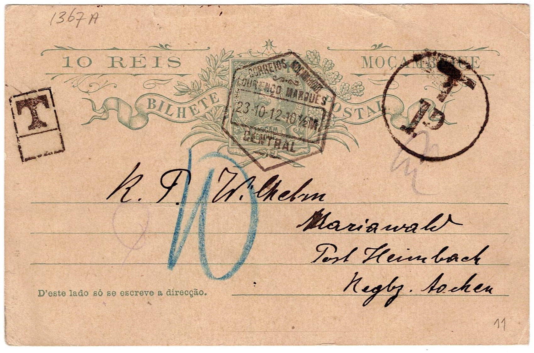 Marques, sent on 23.10.1912 to Heimbach, near Cologne. As the postage was insufficient, it was couriered in Lourenço Marques, T framed, and on the way through South Africa with T/1D.(Image 1)