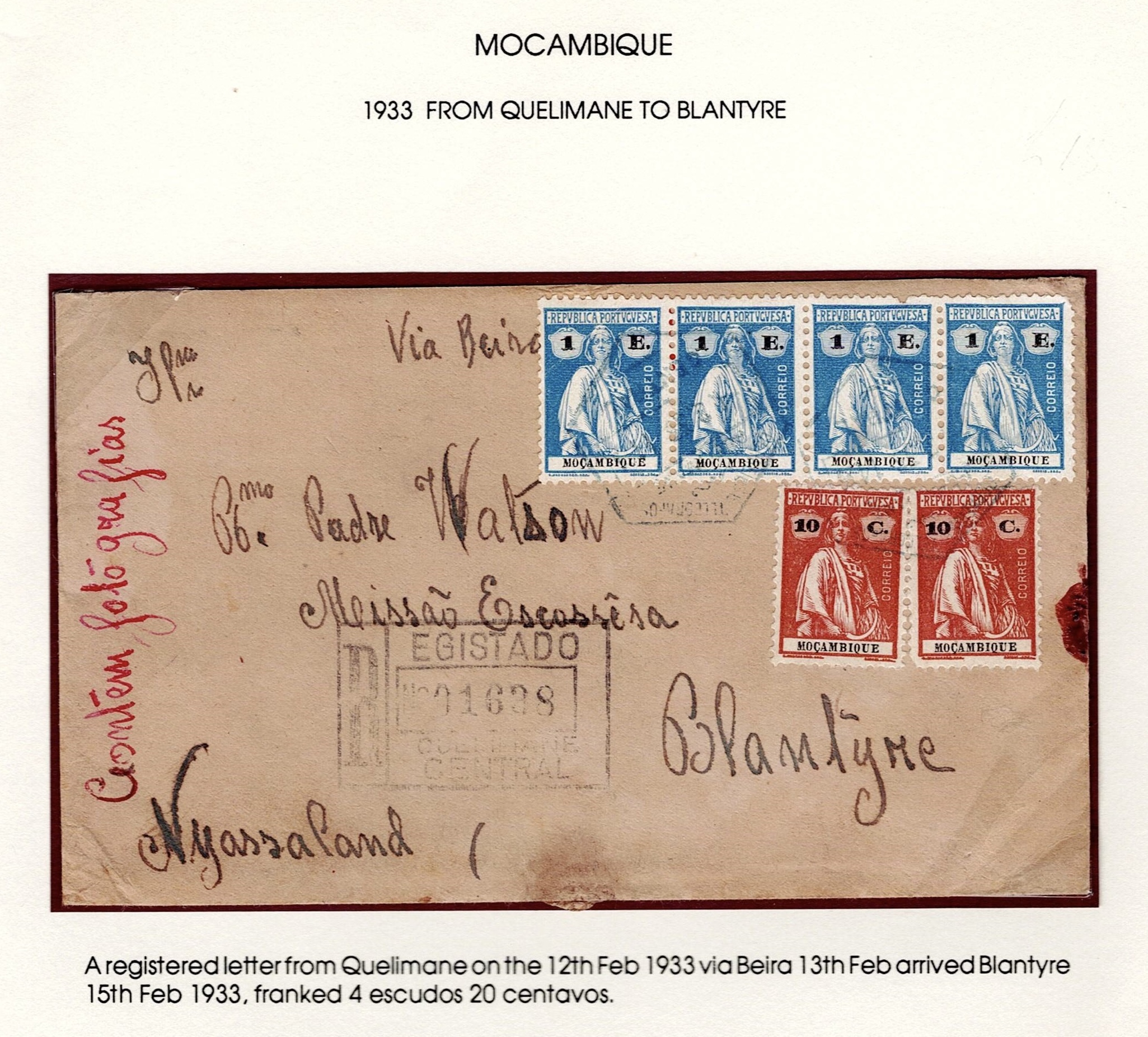 Mozambique 1933. Letter registered in Quelimane, postage of 4$20, to Blantyre, transit in Beira on