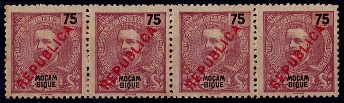 Mozambique 1917 – D. Carlos I, with locally typed REPUBLICA overprint. Horizontal strip of 4 stamps of
