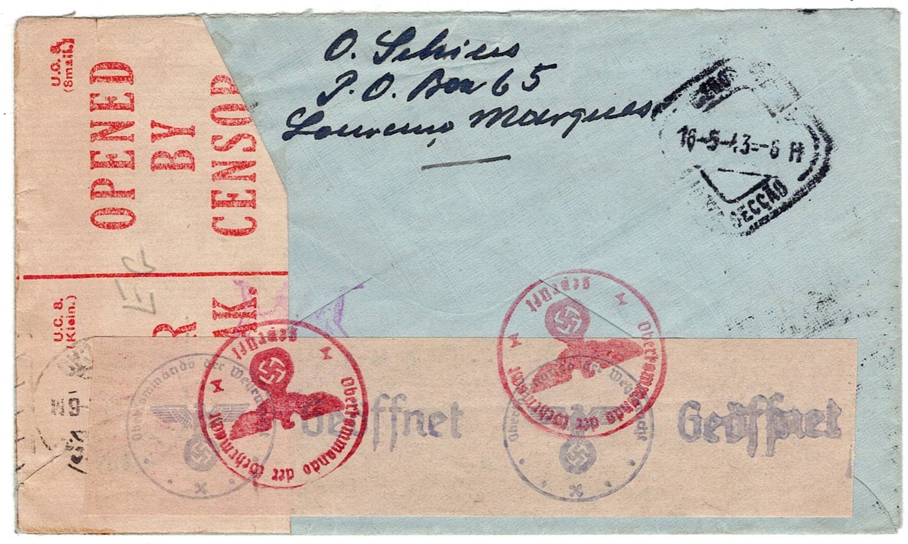 Empire, to Zurich. It was censored in South Africa and Germany, transit in Lisbon on 16.5.(Image 1)