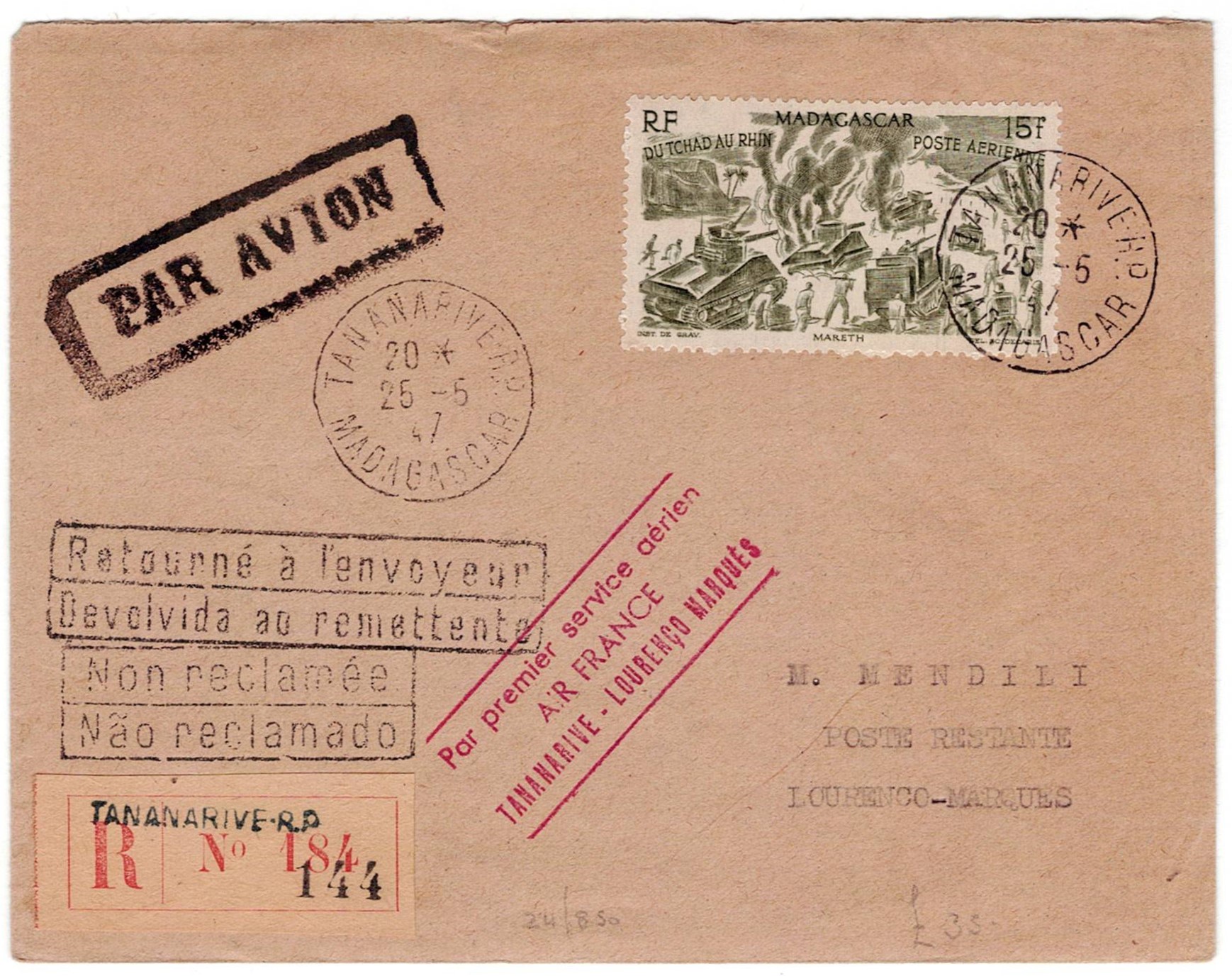 Madagascar. Lourenço Marques. 1947. Registered letter sent from Tananarive on 25.5.1947, postage of 15