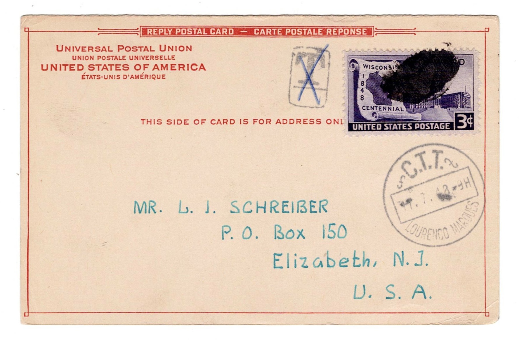 Postage stamp Lourenço Marques.1948. 3 cent US Reply Postage Stamp, sent from Lourenço Marques on