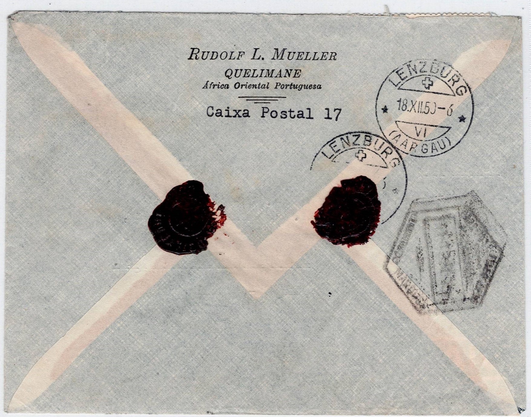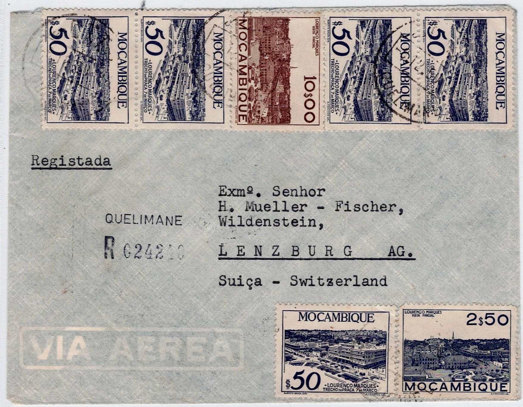 Mozambique. Letter registered in Quelimane, issued on 8.12.1950, to Switzerland, postage of 13$00.