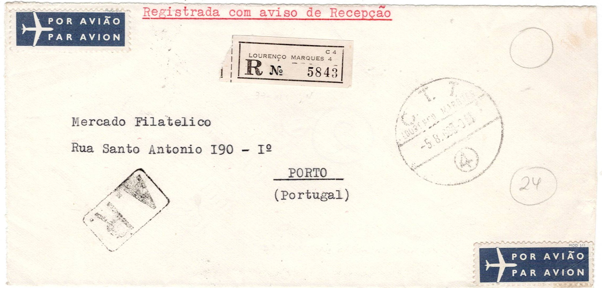 Mozambique. Front of registered letter with acknowledgement of receipt, sent from Lourenço Marques on 5
