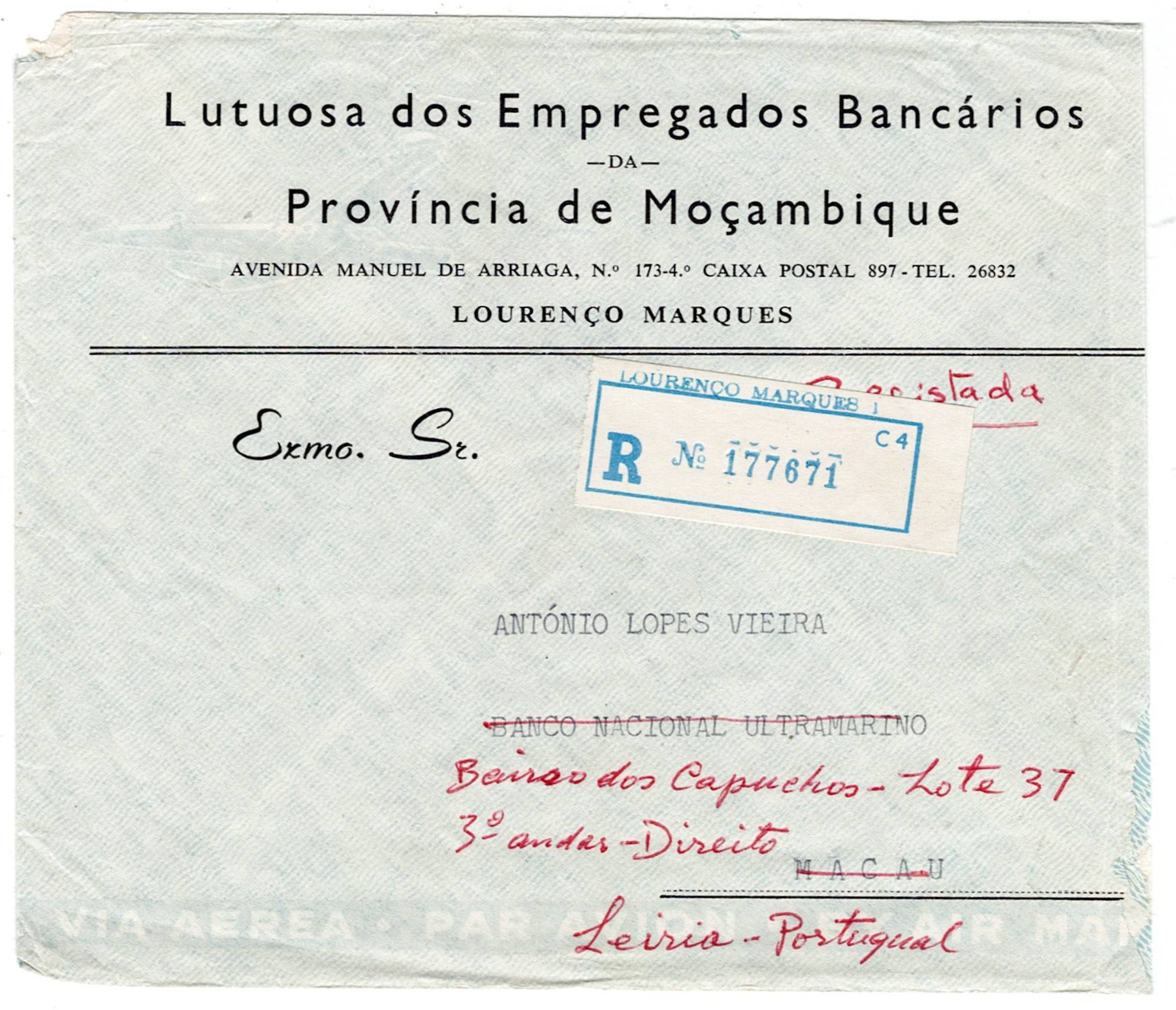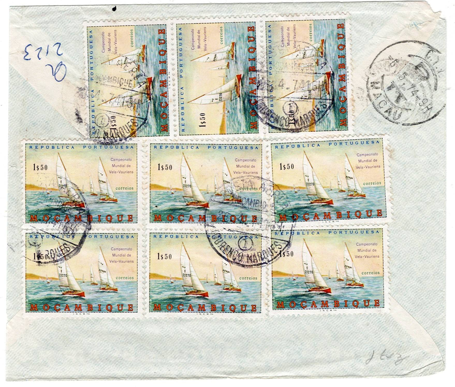 Mozambique. Registered letter sent from L. Marques on 23 April 1974, to Macau, postage on the back of