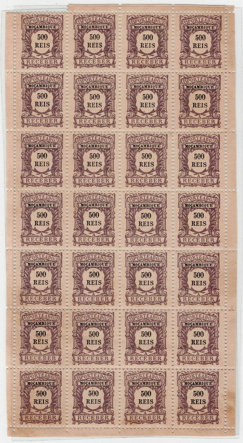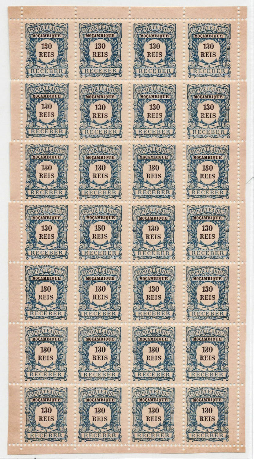 Mozambique 1904 Postage stamp, regular issue. Full sheet with 3 intact margins, of 28 postage stamps