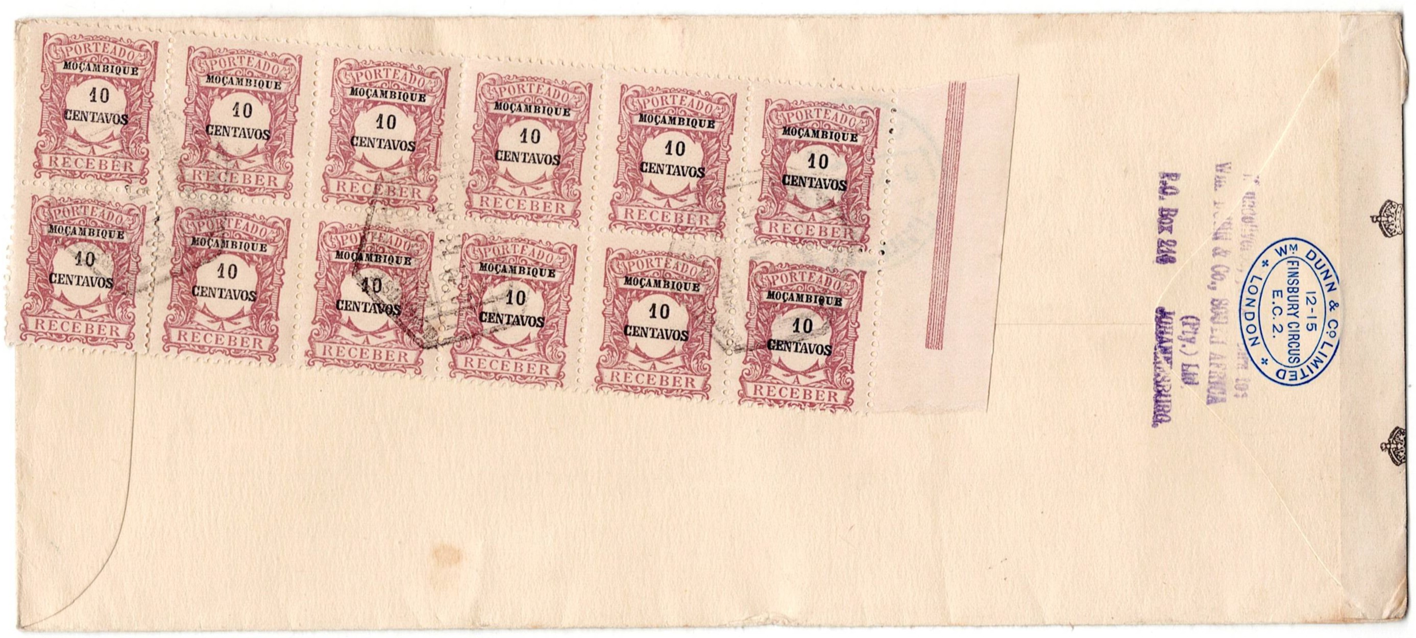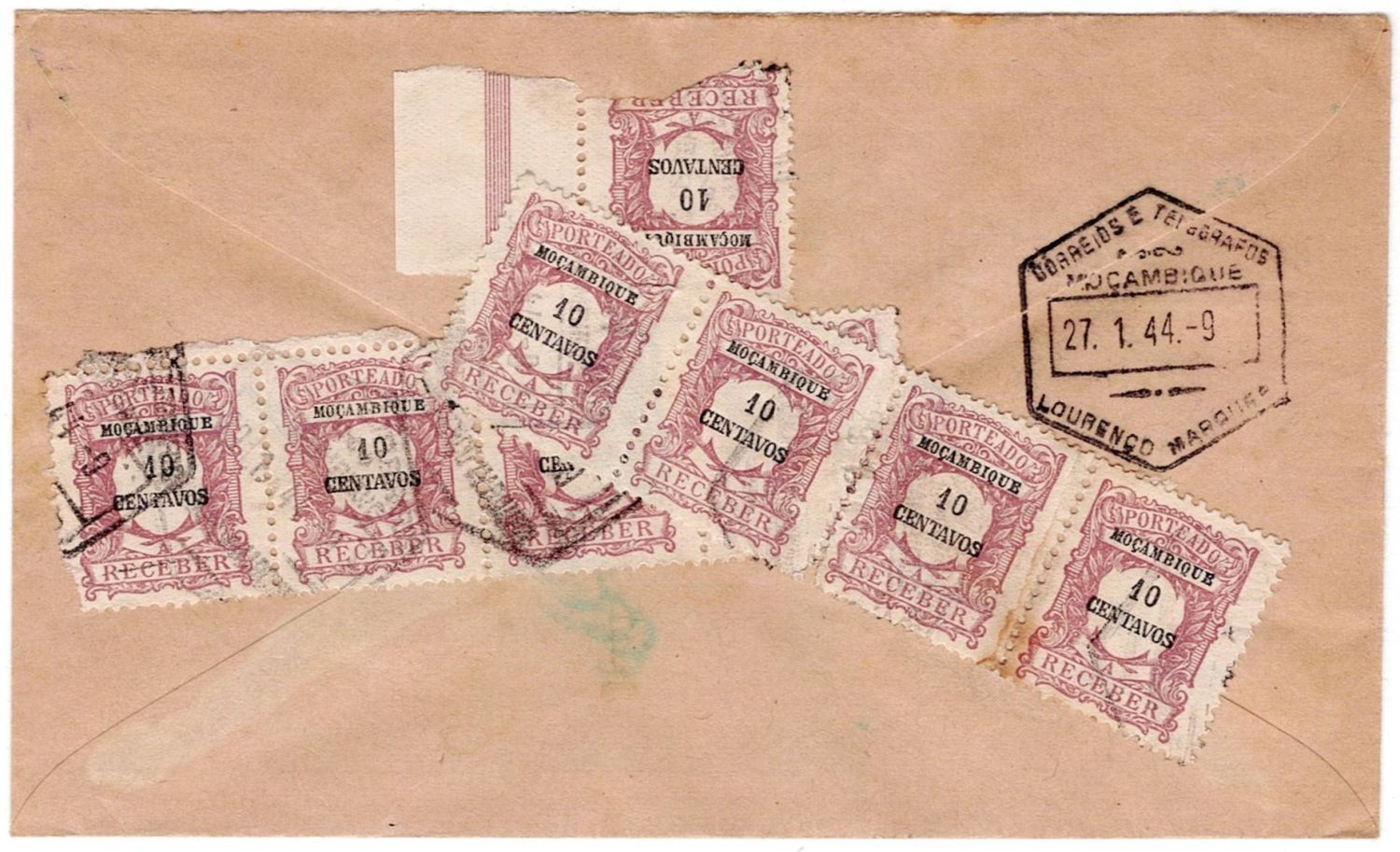 of 2 ½ d, stamped for insufficient postage on arrival at 1$20 escudos, with a block of 12 10-cent stamps, leaf edge, with Lourenço Marques's invalidation of 20.11.1941. It was opened by the English censor. R.(Image 1)