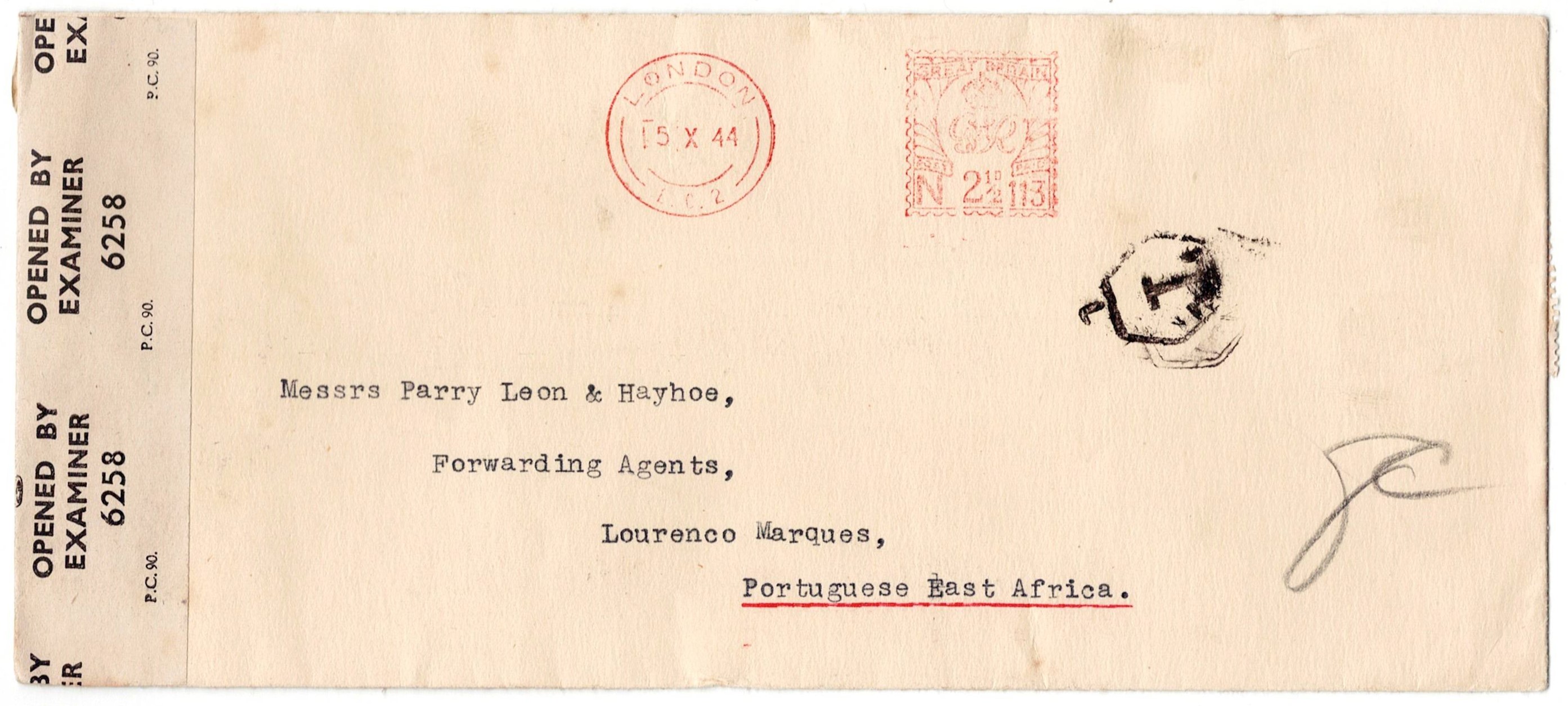 Mozambique. England. Postage stamped. 1944. Letter sent from London on 15.10.1944, mechanical franking