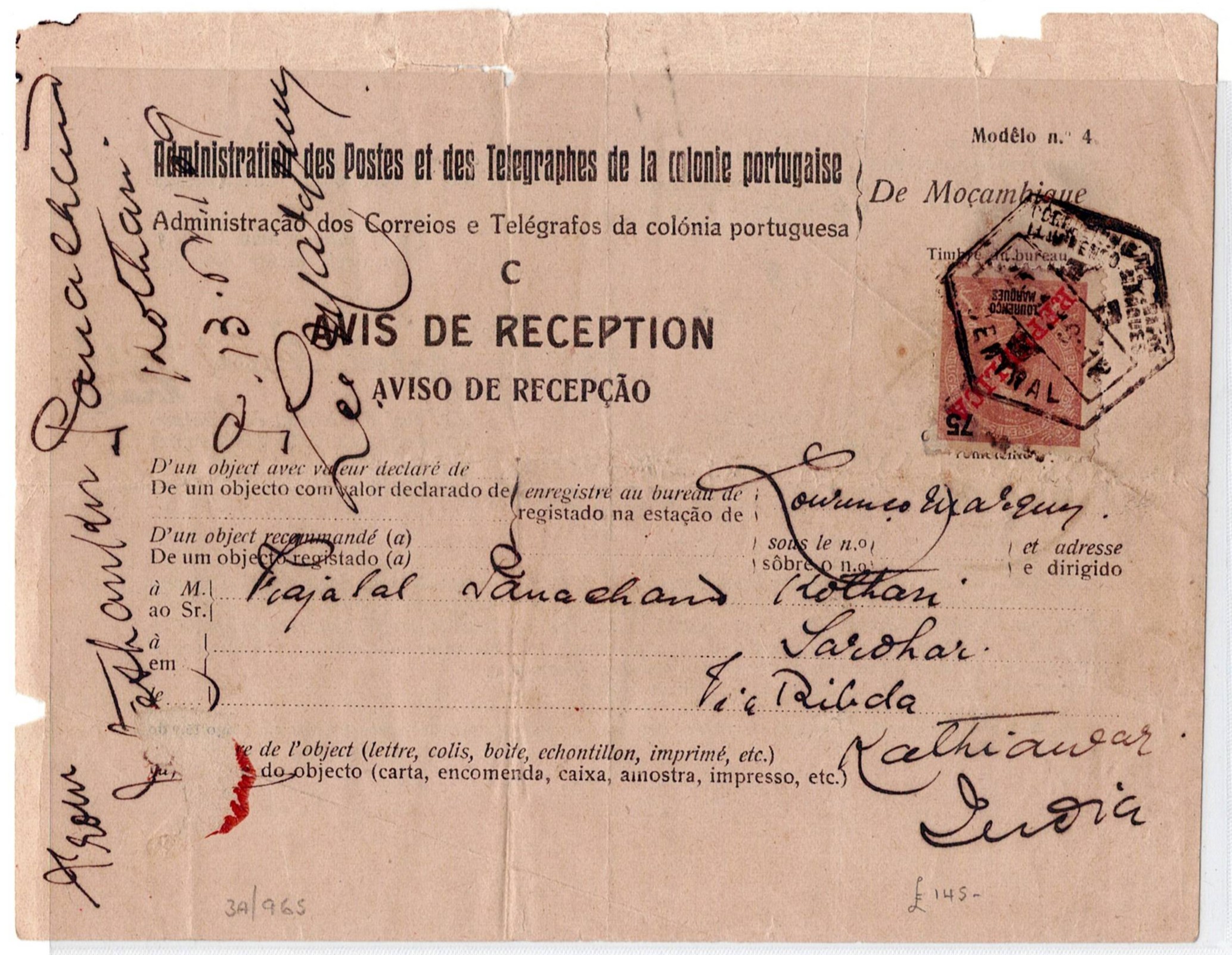 2061 imageLourenço Marques. 1918. Printed form of shipment of declared value with acknowledgement of receipt, dated 26.3.1918, postage of 75 reis D. Carlos Mouchon sc, Republic, to India. Scarce, with small defects in the margins of the printed form.(Image 1)