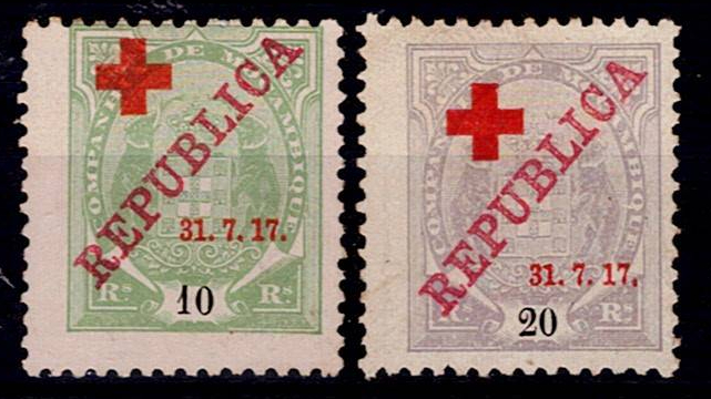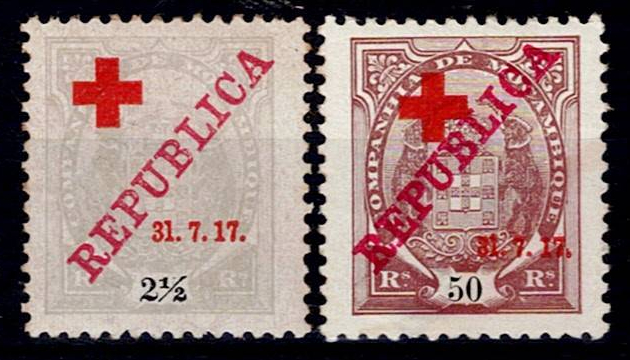 2062 imageMozambique Company 1917 Elephants overprinted with "Republic" and Red Cross. Lot of 2 stamps: Mf#107b, 110b, both with a larger "1" of "31", plain/medium porcelain paper, both gummed and hinged, with thinning, good color. Catalogue value €165.(Image 1)