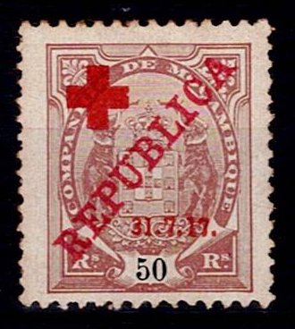 2064 imageMozambique Company 1917 Elephants with "Republic" and Red Cross overprint. Mf#110d, with "5" with short flag, medium porcelain paper, ungummed and oxide. Catalogue value €130.(Image 1)