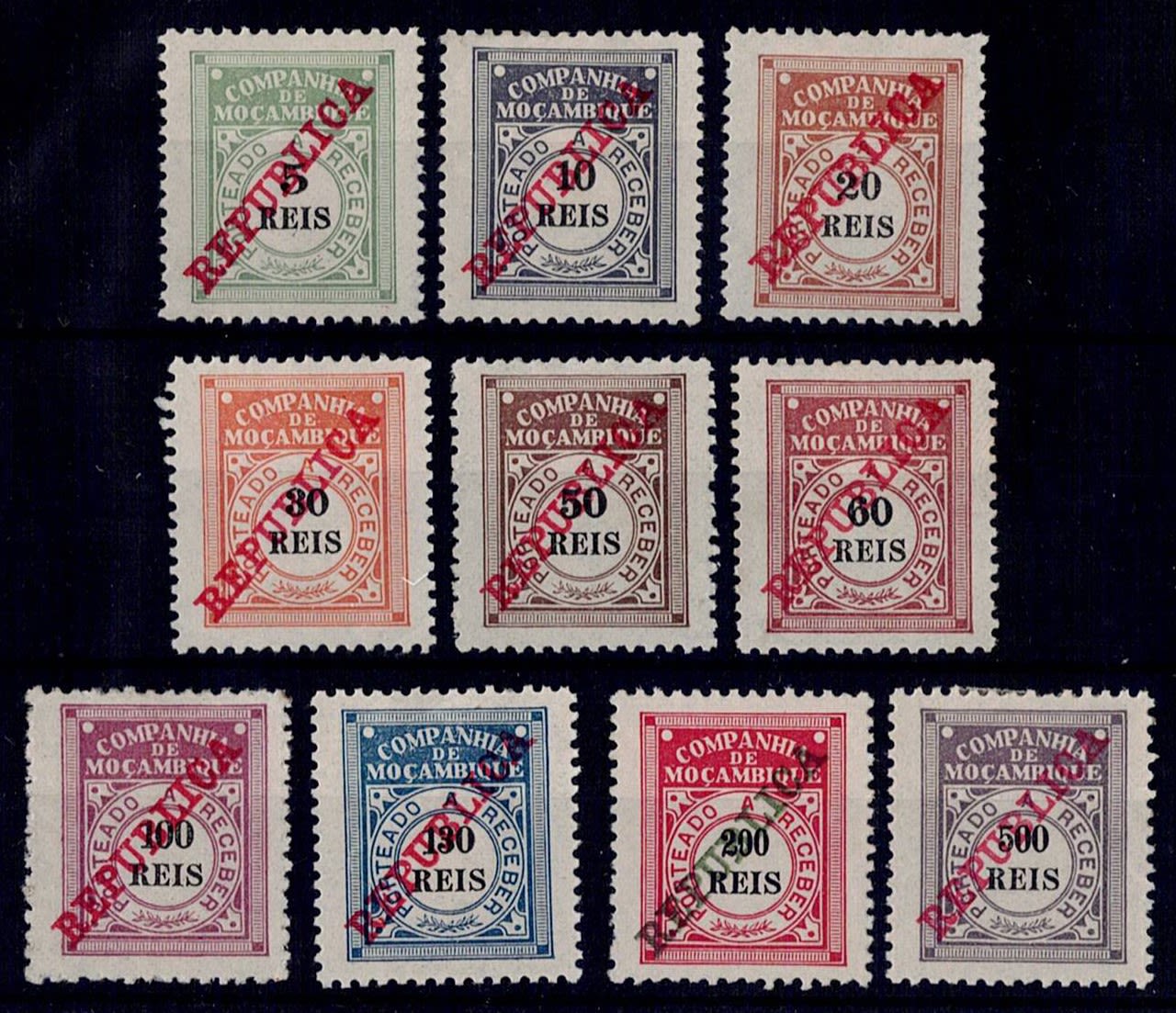 2065 imageCompanhia de Moçambique 1911 Postage Due type 1904 with overprint Republic. Complete series Mf#P11-20 of new stamps, with or without gum and with hinge, with good color. Catalog value €55.(Image 1)