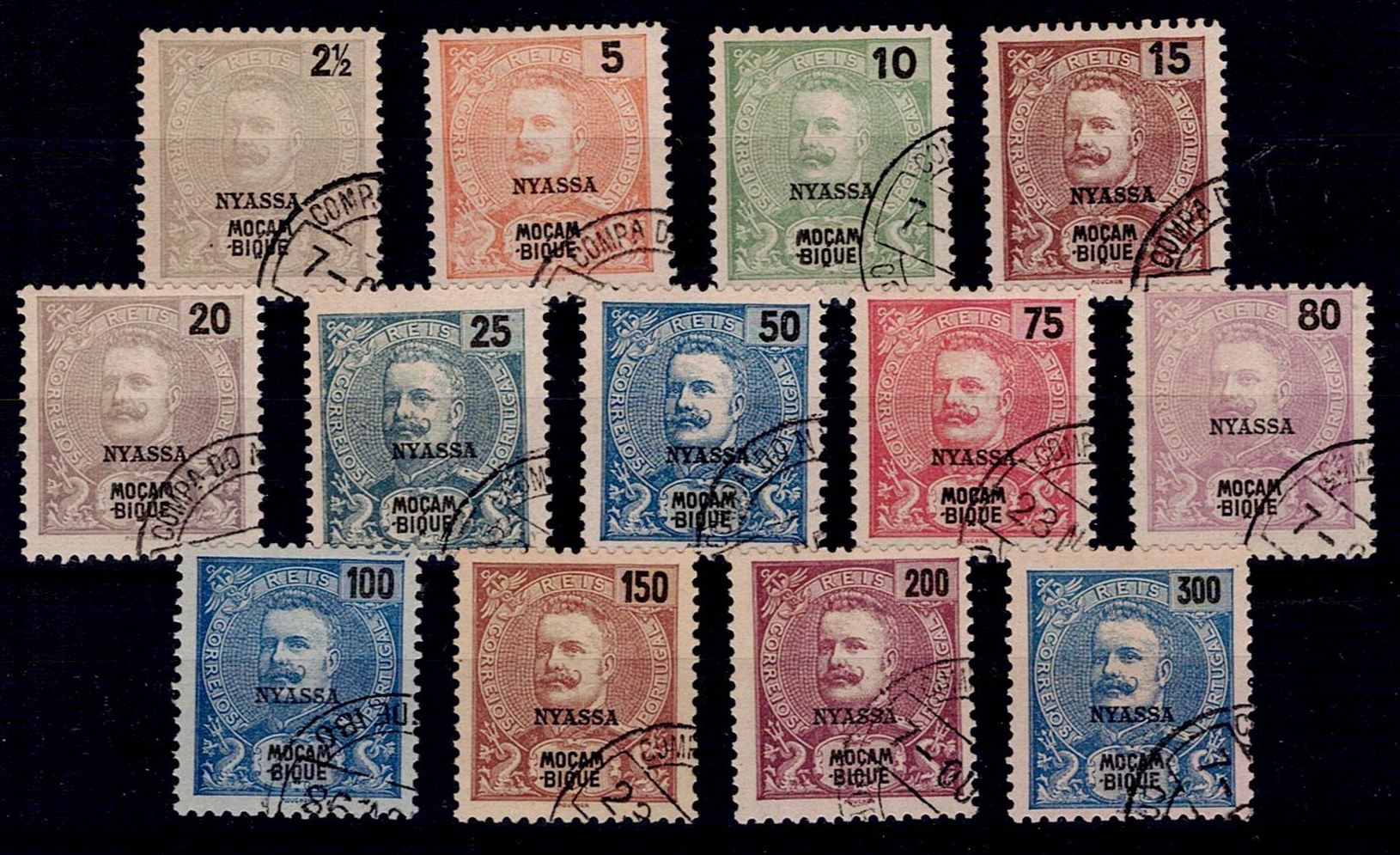 2066 imageNiassa 1898 D. Carlos Mouchon with NYASSA overprint. Complete series of stamps Mf#14-26 in postmarked stamps, with good color, without defects or repairs (except traces of oxide on the 300 reis). Catalogue value €50.(Image 1)