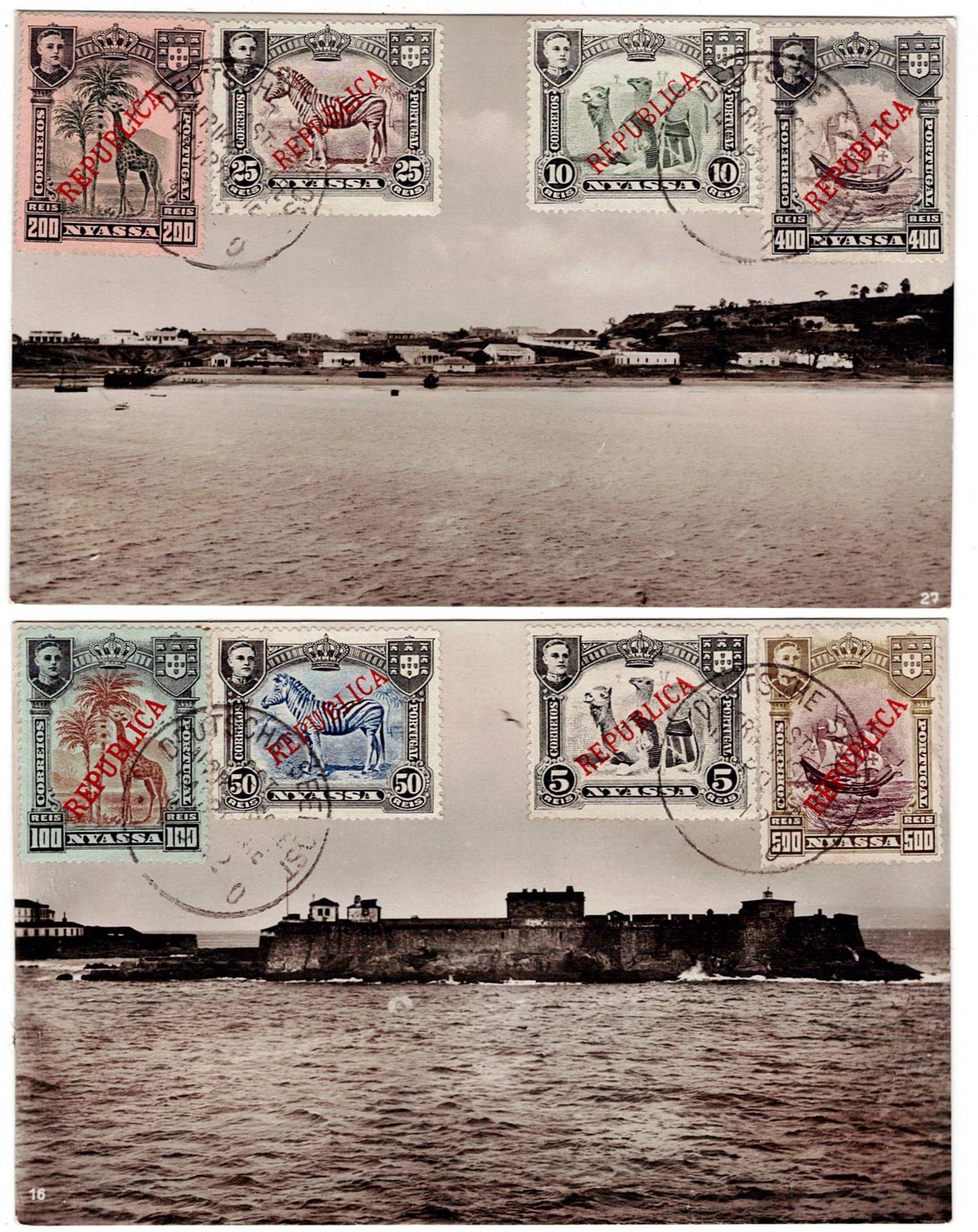 2069 imageNiassa Company 1911 D Manuel II with Republic overprint. Two monochrome postcards from Mozambique with four stamps each, all different, glued and stamped on the front with German seamarks. Uncirculated postcards with large paper adhesions on the back due to being pasted in an album.(Image 1)