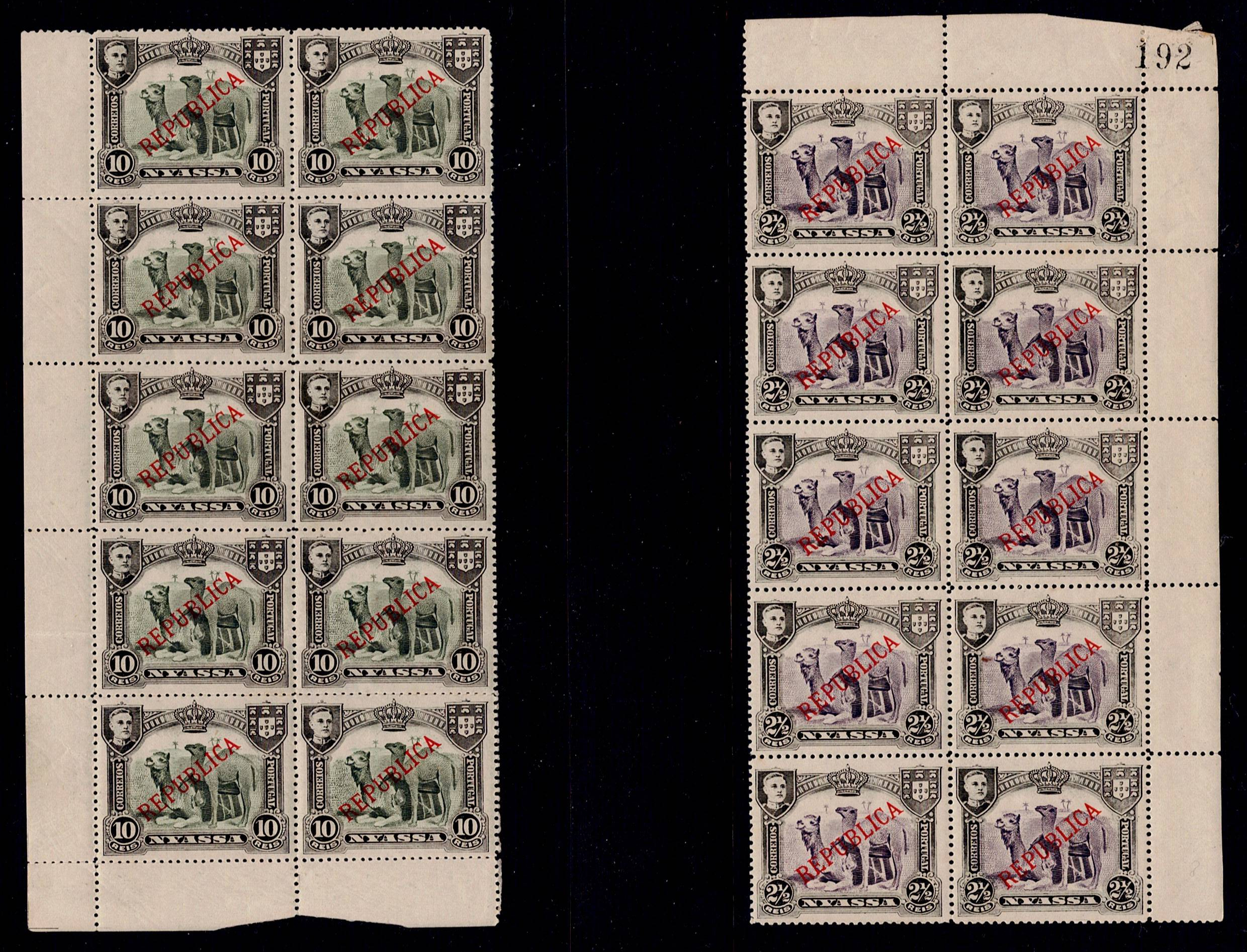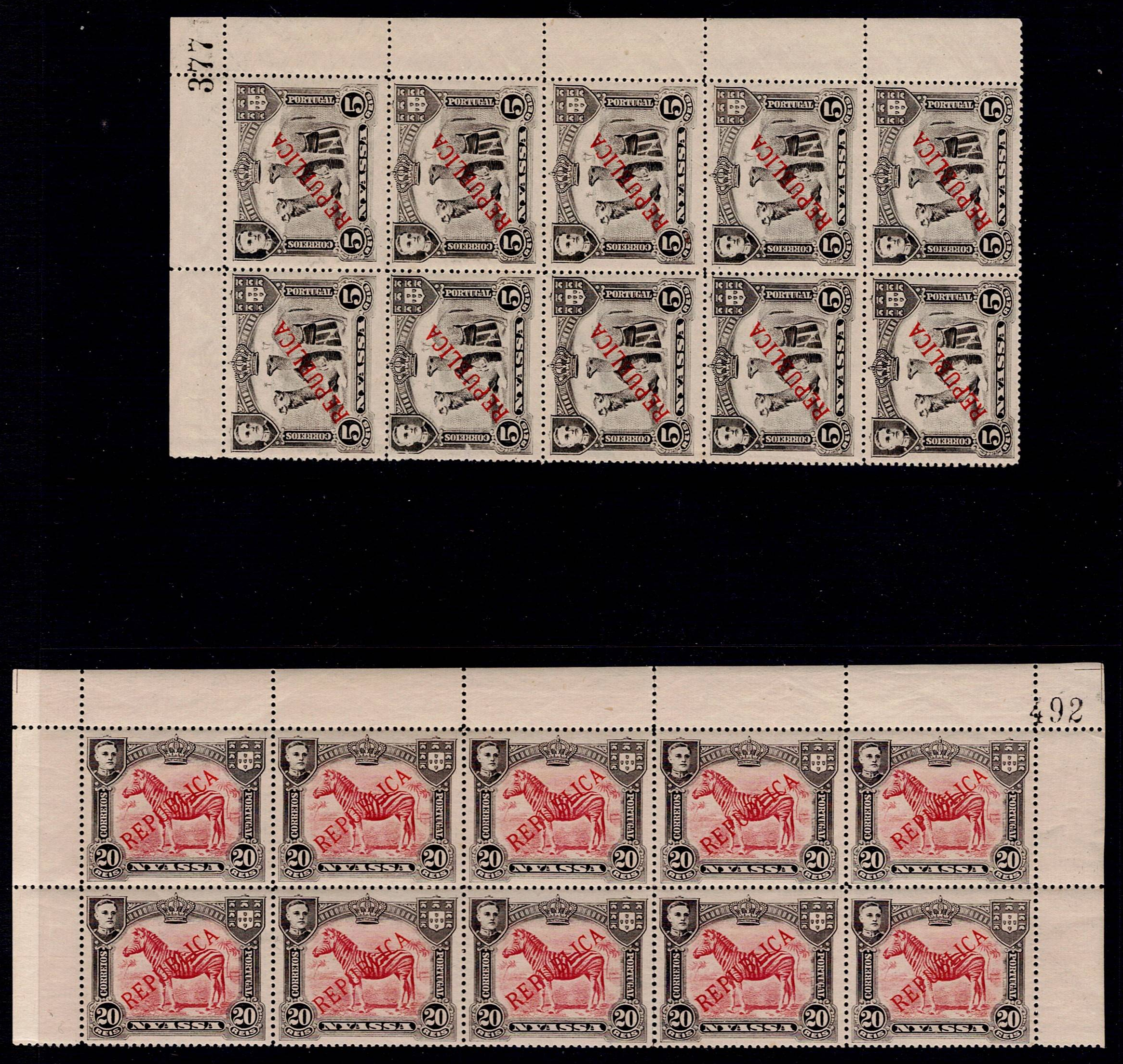 2070 imageNiassa Company 1911 D. Manuel II with Republic overprint. 4 BLOCKS of 10 stamps in sheet corner Mf#52-55, from 2.5 reis violet to 20 reis carmine, in new stamps with original gum and without hinge, with some traces of oxide, printed by Waterlow & Sons, Ltd, in London. Catalog value €200. Fragile, with some loose serrations.(Image 1) (Image 2)