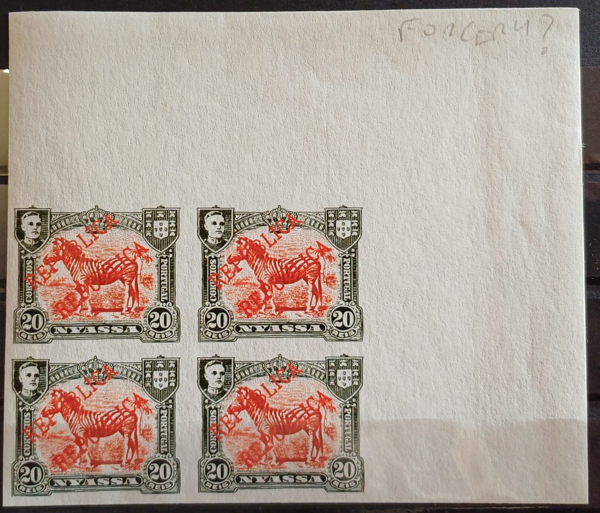 2071 imageNiassa Company 1911 D Manuel II with Republic overprint FAKE. FAKE printing of non-dented BLOCK of Mf#55 stamps of 20 reis, with supposed double Republic overprint. FAKE.(Image 1)