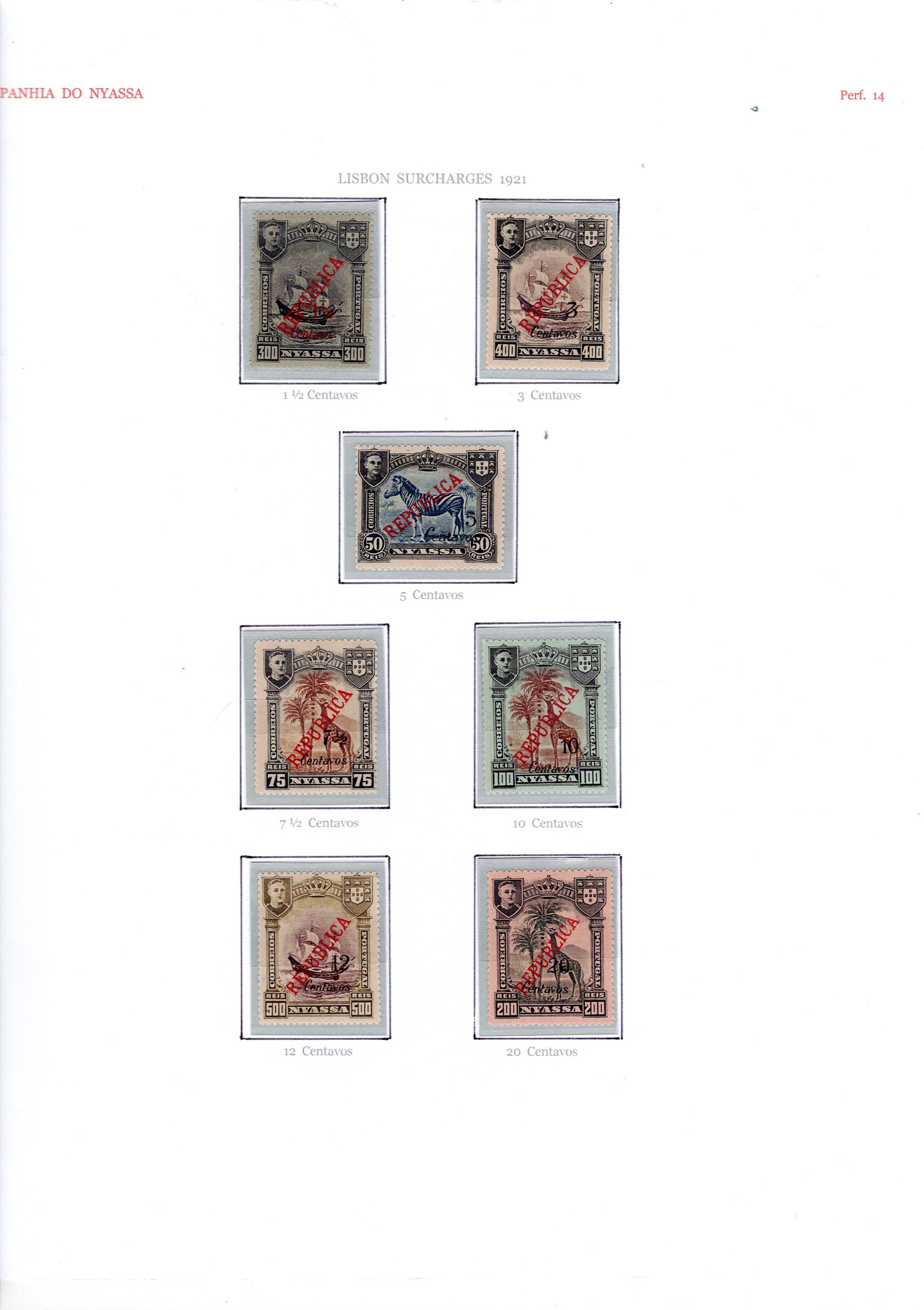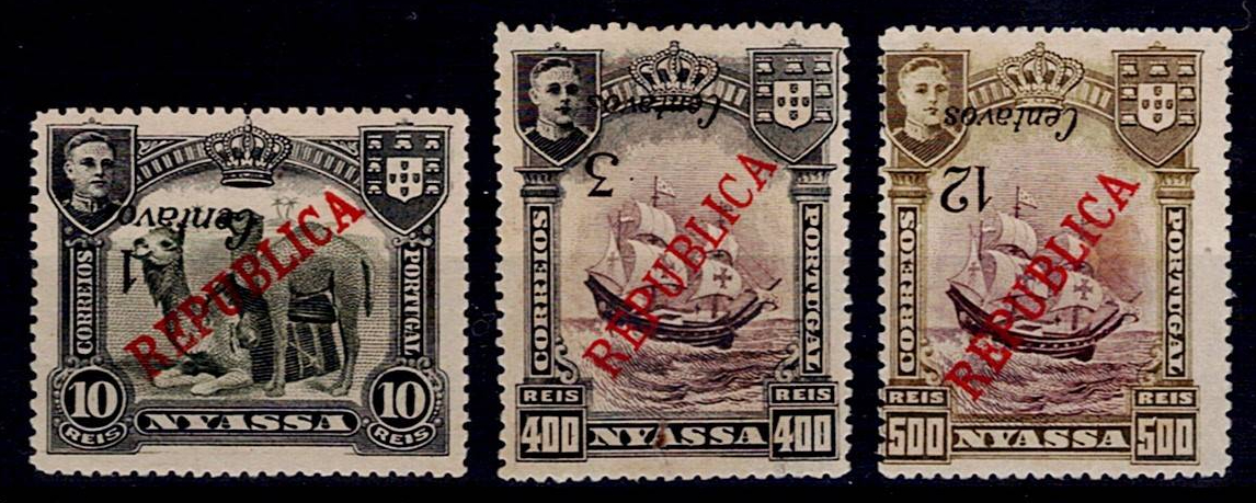 2074 imageNiassa Company 1921 D. Manuel II, with “REPUBLICA” overprint from the Casa da Moeda and overcharge lithographed in Lisbon. 3 stamps with the INVERTED SURCHARGE: Mf#84a, 1 cs/ 10 réis (with hingeless gum) + Mf#88a, 3c s/ 300 réis (without gum) + Mf#92a, 12c s/ 500 réis (without gum). New copies, with good color. Catalog value € 70.(Image 1)