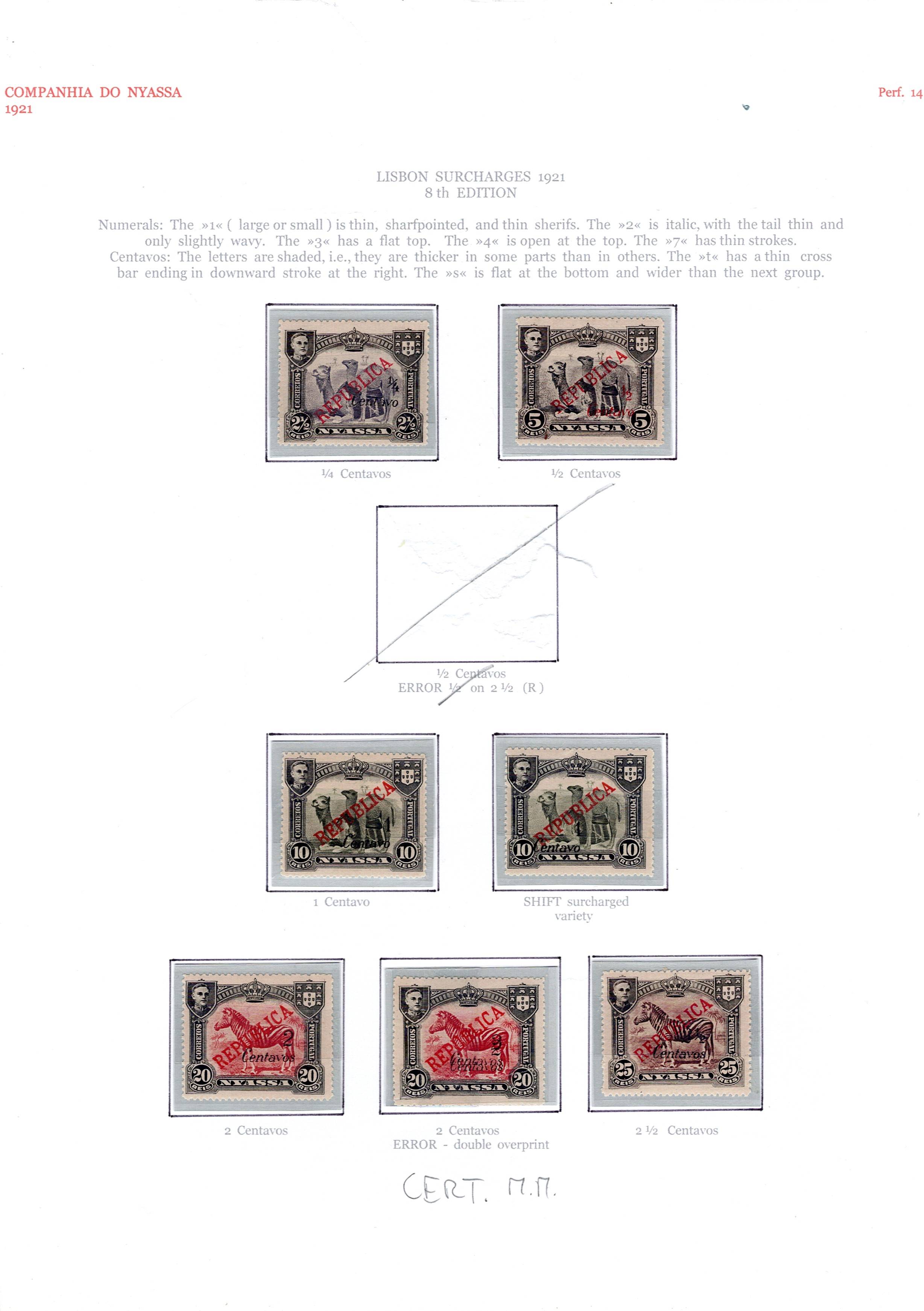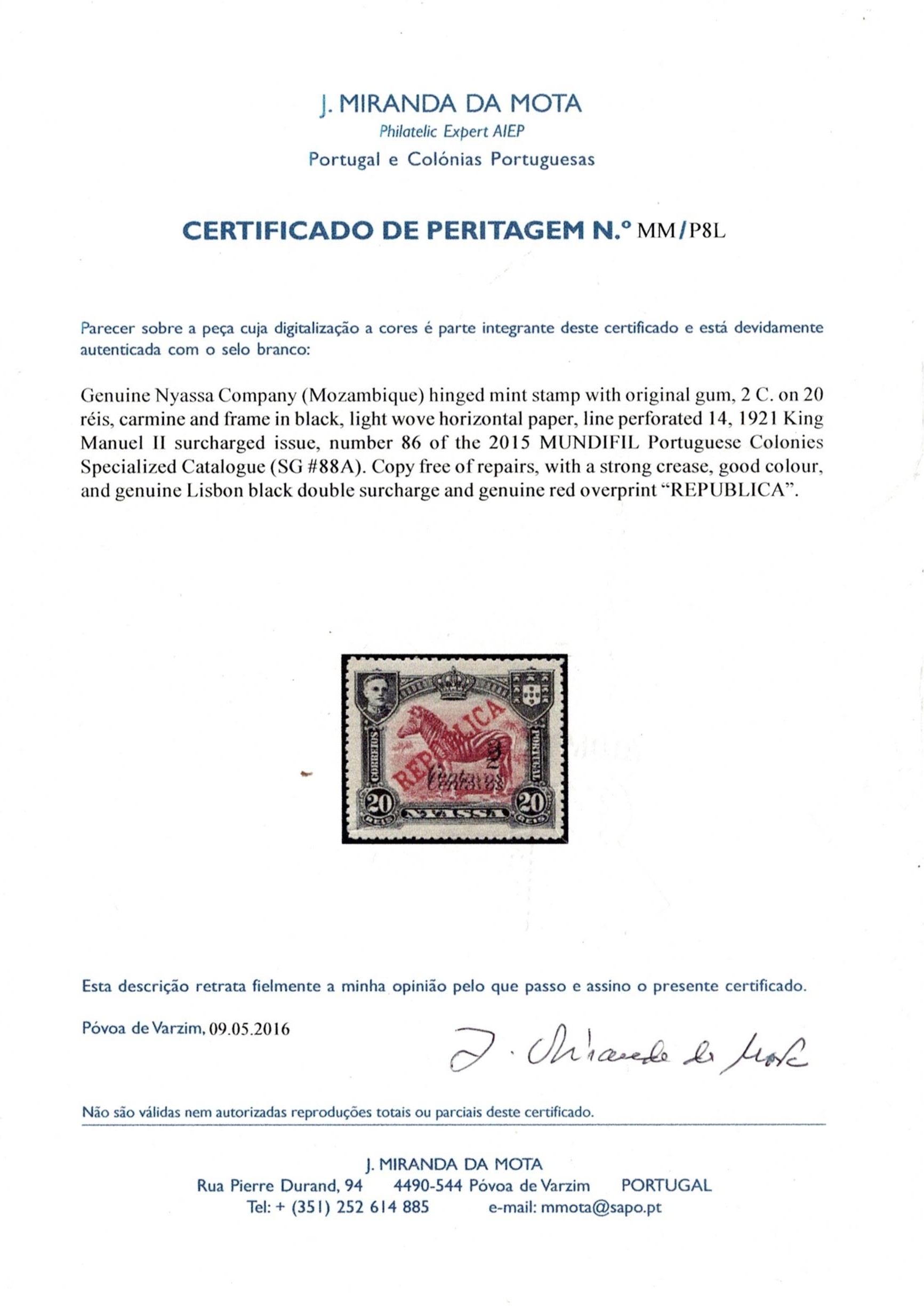 2072 imageNiassa Company 1921 D. Manuel II with Republic overprint - LISBON. Complete series of stamps Mf#82-93 + Mf#86a VARIETY double overprint. New stamps with original gum and hinge, and in good color. Stamp Mf#86a has a J. Miranda da Mota Certificate, BUT the crease was more damaged and is now a horizontal cut in the stamp (not counted towards the lot value). Catalog value €114.(Image 1) (Image 2) (Image 3)