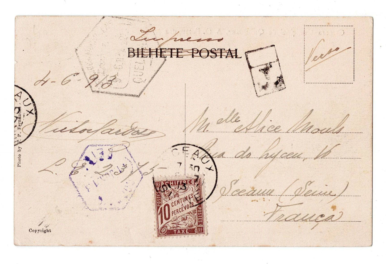 2077 imagePOSTAGE. Mozambique. Illustrated postcard of Quelimane, issued on June 9, 1913, from Quelimane, franked as printed at 8.5 cents, with Ceres de Quelimane stamps, postage in Quelimane, with the Rectangular mark, passed through Beira at June 11, to Sceaux, in France, where it arrived at June 8, postage at 10 cents. According to the 1912/3 table, the postage for a postcard abroad was 2 cents, 1 cent as printed. The postcard must have been delivered to the unfranked post office, for which it had to pay a 2-cent fine. The Quelimane stamps were added later to the circulation, as they only entered circulation in 1914.(Image 1) (Image 2)