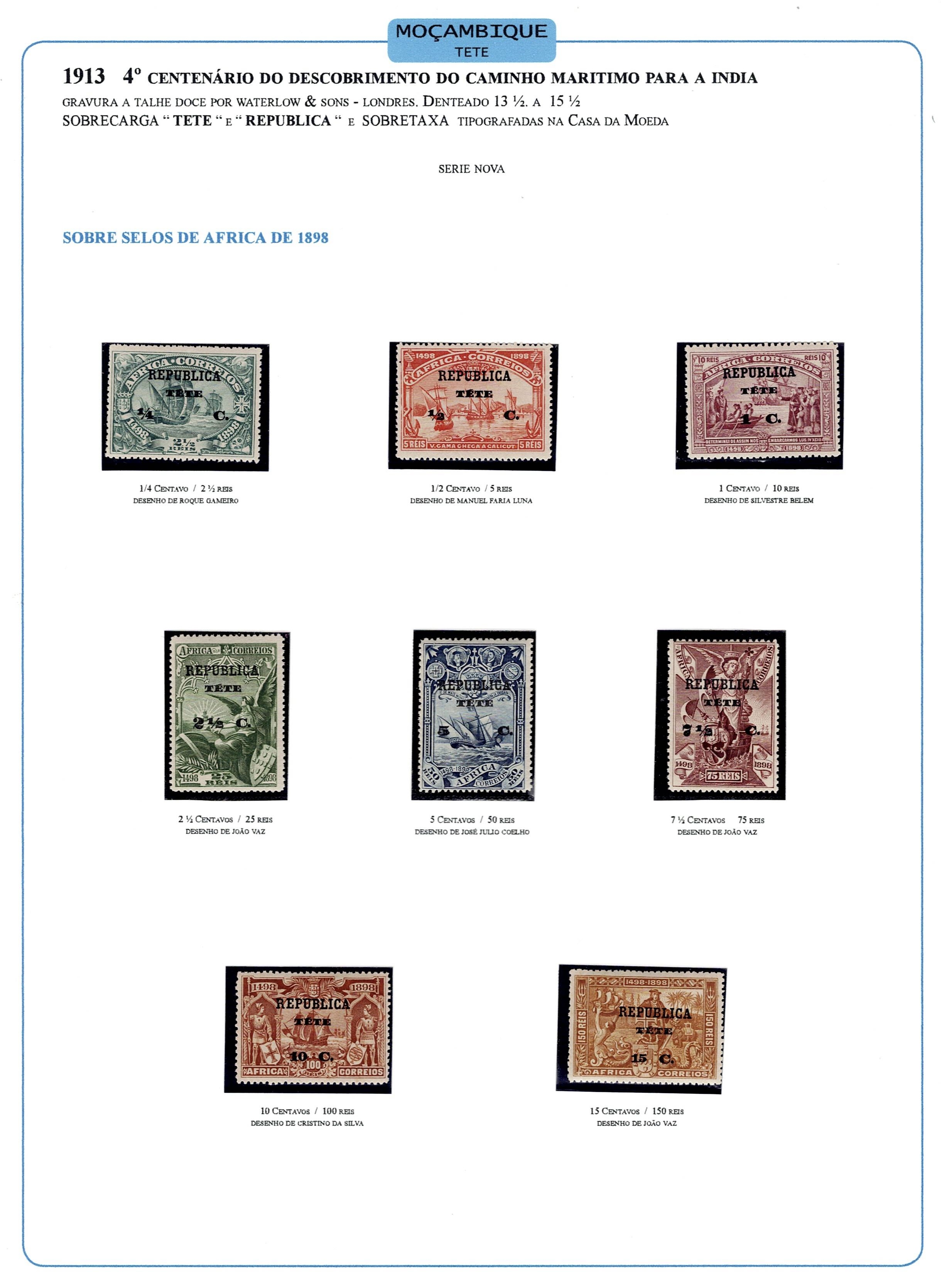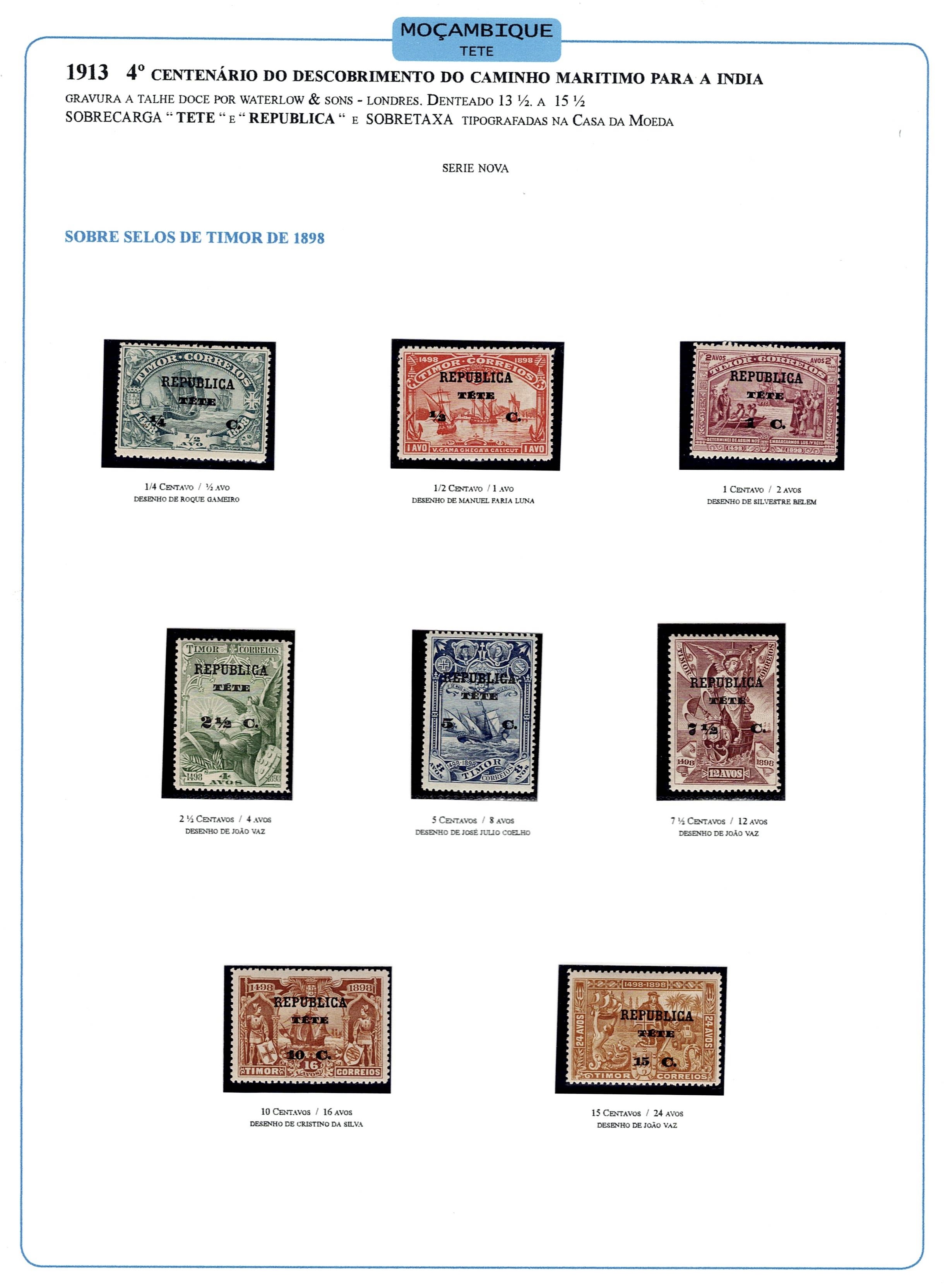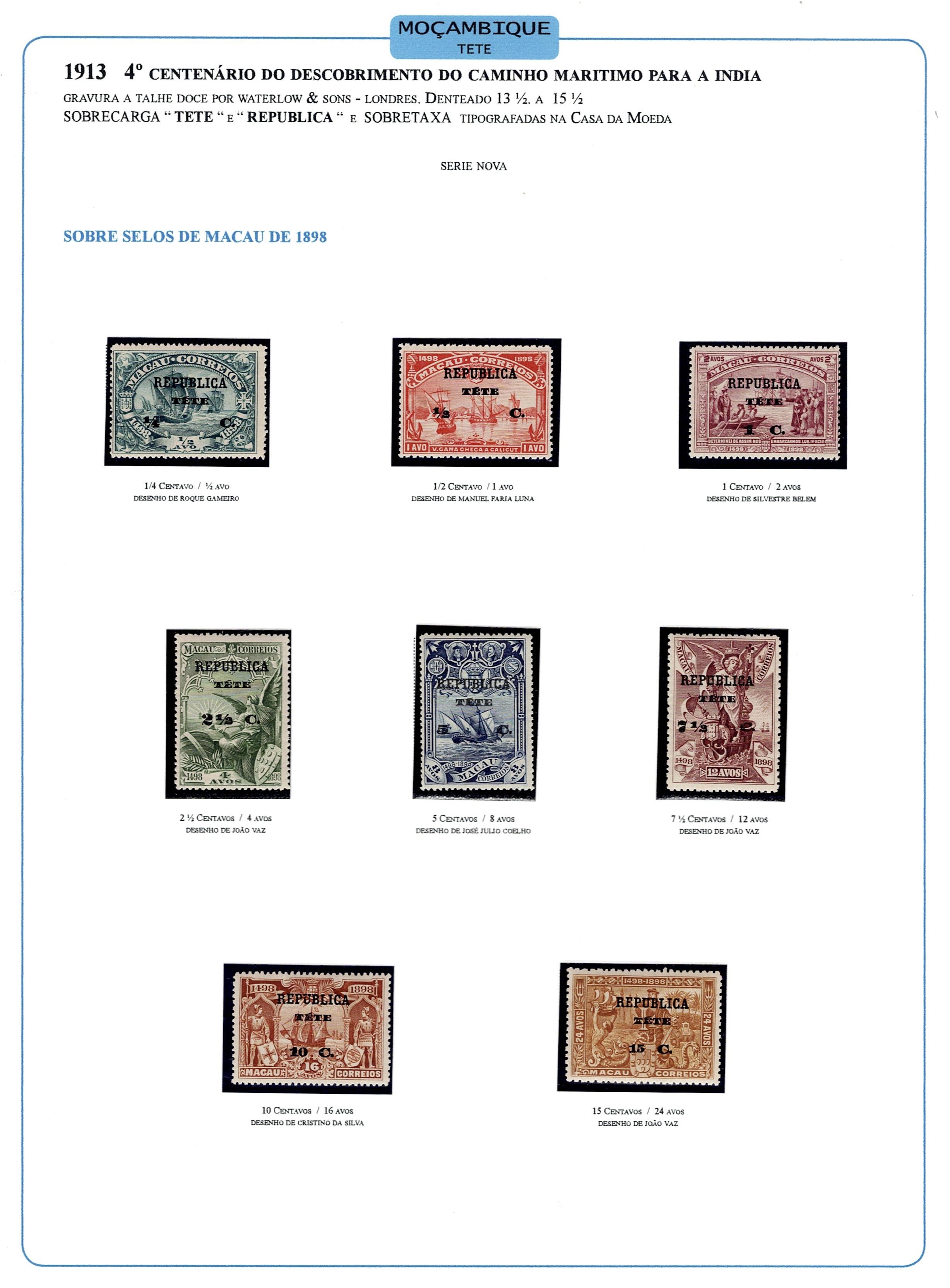 2078 imageTete 1898 – 4th Centenary of the Discovery of the Sea Route to India. Lot with the 3 complete series of stamps from AFRICA; MACAU and TIMOR, Mf#1-24, on new stamps, with gum and with a slight hinge sign, and good color. Mounted on a collector's sheet and attached with HAVID ribbon. Catalogue value € 115.(Image 1) (Image 2) (Image 3)