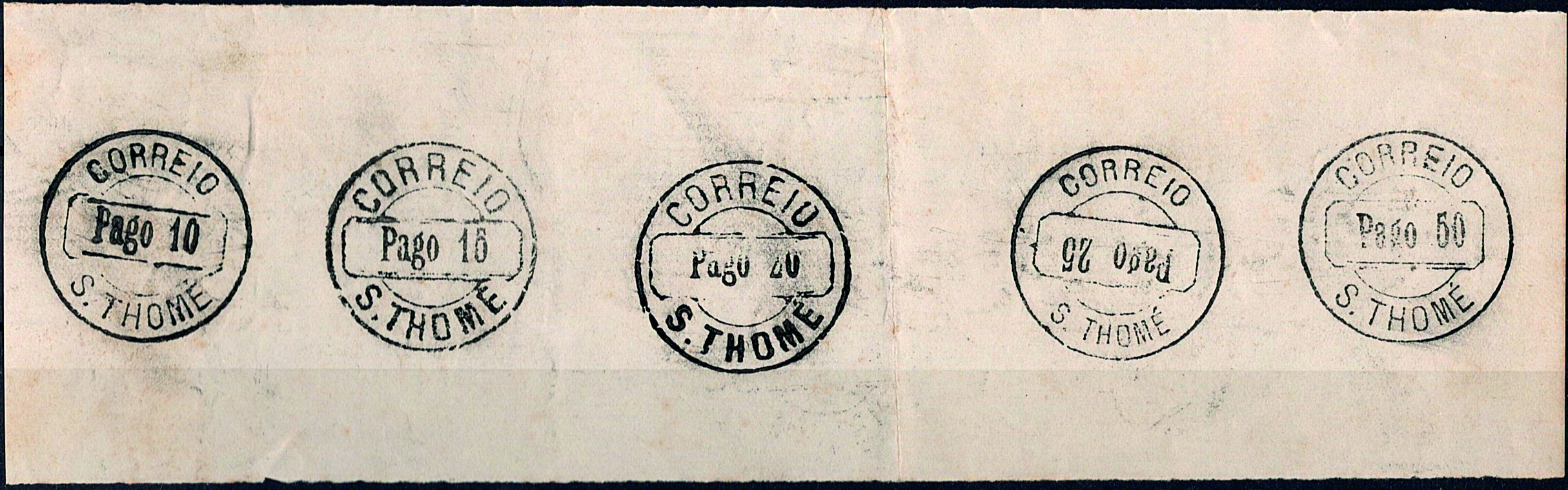2080 imageSão Tomé and Príncipe * 1899 – Provisional issue fixed stamps. Fragment with five fixed stamps obliterated in black “CORREIO / S. THOMÈ”, “PAGO 10” + “PAGO 15” + “PAGO 20” + “PAGO 25” + “PAGO 50”, with the value of the 25 réis stamp INVERTED. Fixed stamps authorized by the announcement of 17.06.1899, published in the Official Bulletin of São Tomé and Príncipe. Used only for 22 days.(Image 1)