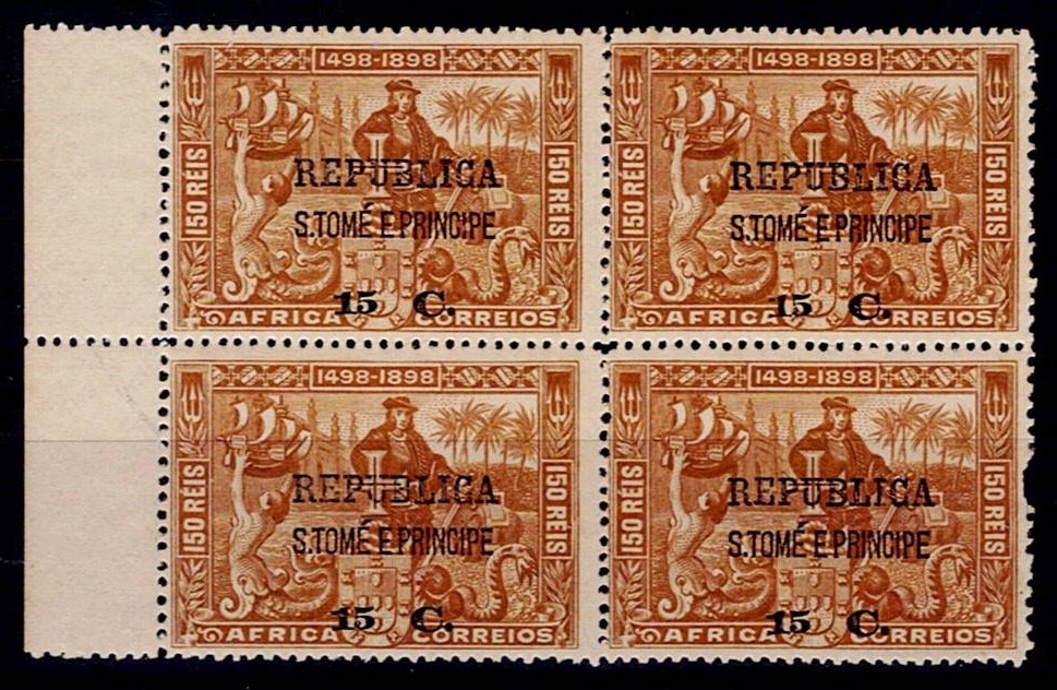 2081 imageSão Tomé and Príncipe 1913 xxx. QUADRA leaf edge of Mf#182 of 15 c. s/ 150 reis in bistre. New stamps, with gum and without hinge (x2) with slight hinge sign (x2), without repairs, with good color. Catalogue value € 29 .(Image 1)