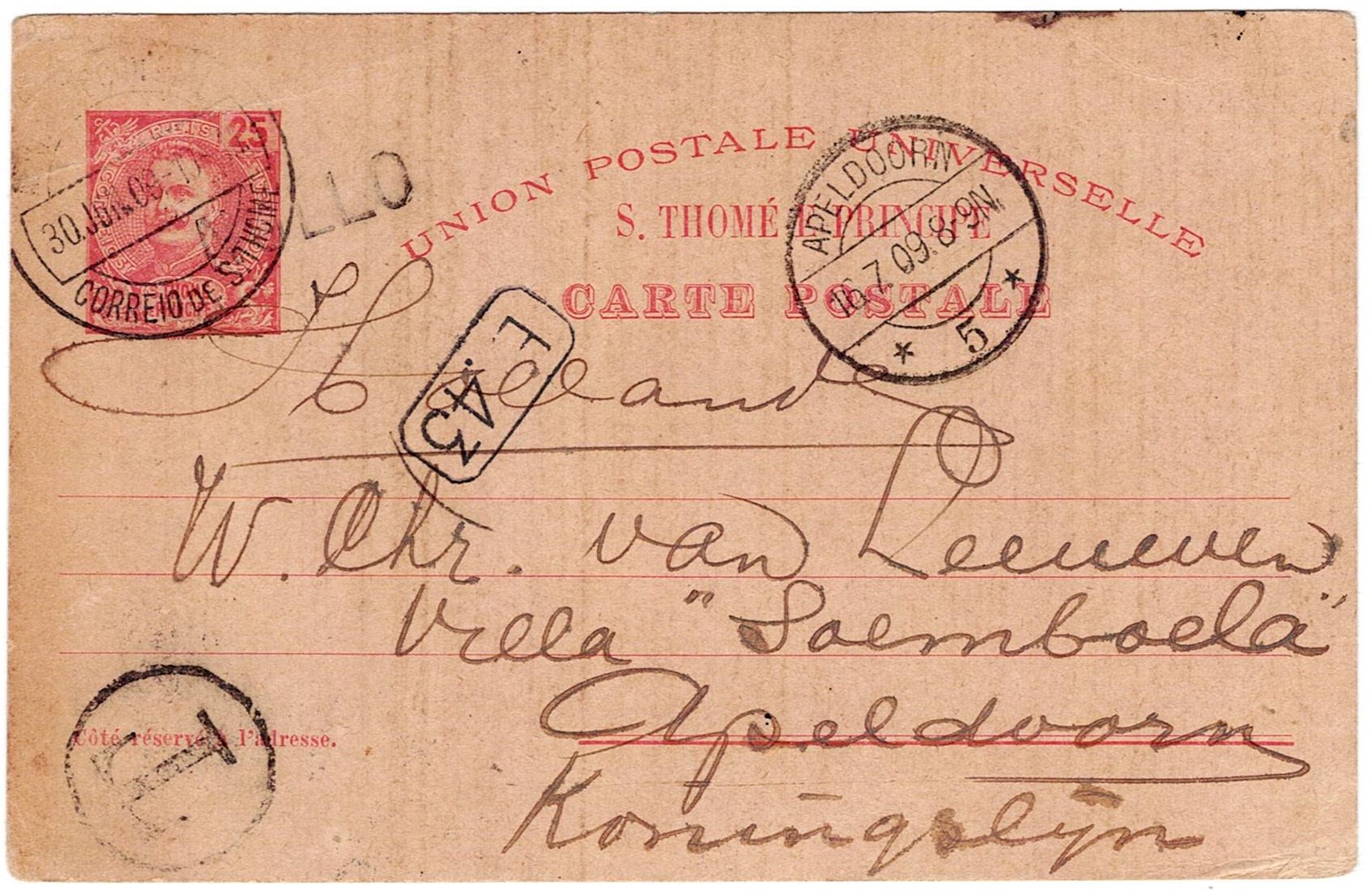 2082 imagePostage stamp. Postal stationery. S. Tomé. IP of 25 reis Mouchon, sent from S. Tomé on 30.6.1909, to Holland. As the 25 reis stationery (OM#5) was withdrawn from circulation on 1.7.1905, it was marked NULL and Postage stamp. Little use of this stationery outside the circulation period.(Image 1)