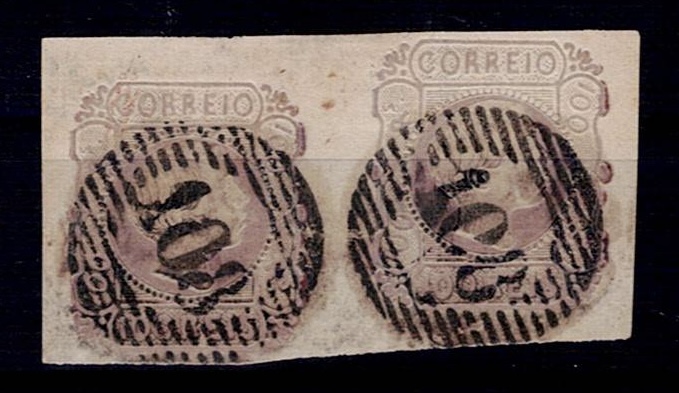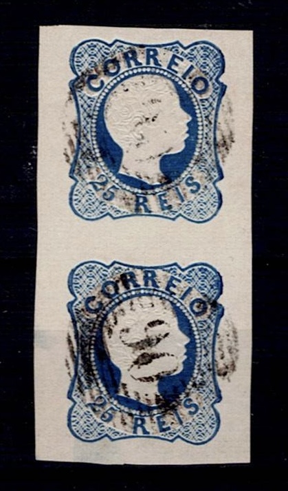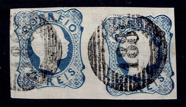 2145 imageMarcofilia Portugal numeric stamps from the 1st reform. 1856-58 D. Pedro RINGED HAIR. VERICAL PAIR of Mf#12, 25 réis, blue, double lines, smooth paper. Used copies, with good relief and color, with a very thinned bottom stamp, obliterated with a 20-bar stamp beaten in black "90 – MONTE-MOR O VELHO”.(Image 1)