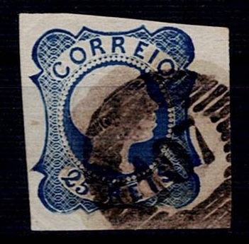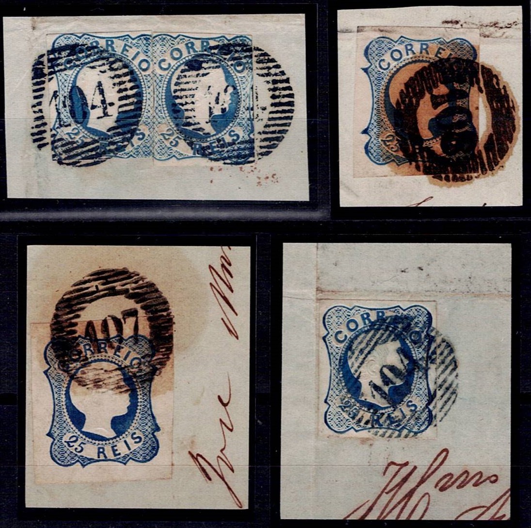 2147 imageMarcofilia Portugal, numeric stamps from the 1st reform – D. Pedro, not indented. Four fragments with 25-reis blue D. Pedro stamps. Used copies, obliterated with well-beaten 20-bar stamps 104, 107, 108.(Image 1)