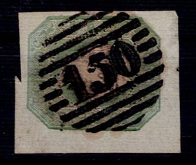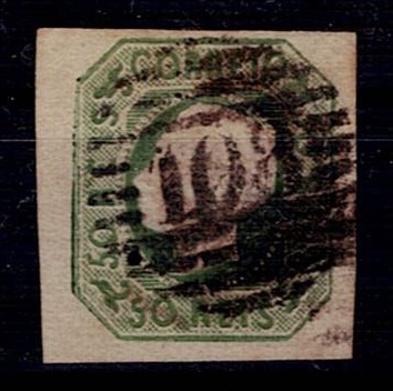 2159 imageMarcofilia Portugal numeric stamps from the 1st reform. 1855-56 D. Pedro STRAIGHT hair. Mf#8, 50 réis, green, smooth paper. Used copy, with short to very good margins, obliterated with a 4-3-4 type stamp struck in black "150 – IDANHA A NOVA”, rarity 3 Mundifil.(Image 1)