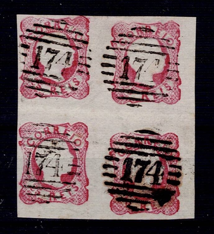 2151 imageMarcofilia Portugal numeric stamps from the 1st reform. 1856-58 D. Pedro RINGED HAIR. QUADRA of Mf#13, 25 réis, carmine, plain paper (probably from stamp III). Used copies, with very good to short margins, with 2 horizontal creases that catch the 4 stamps, and repair on the back, obliterated with a 4-3-4 type stamp struck in black "109 – PONTE DE LIMA”.(Image 1)